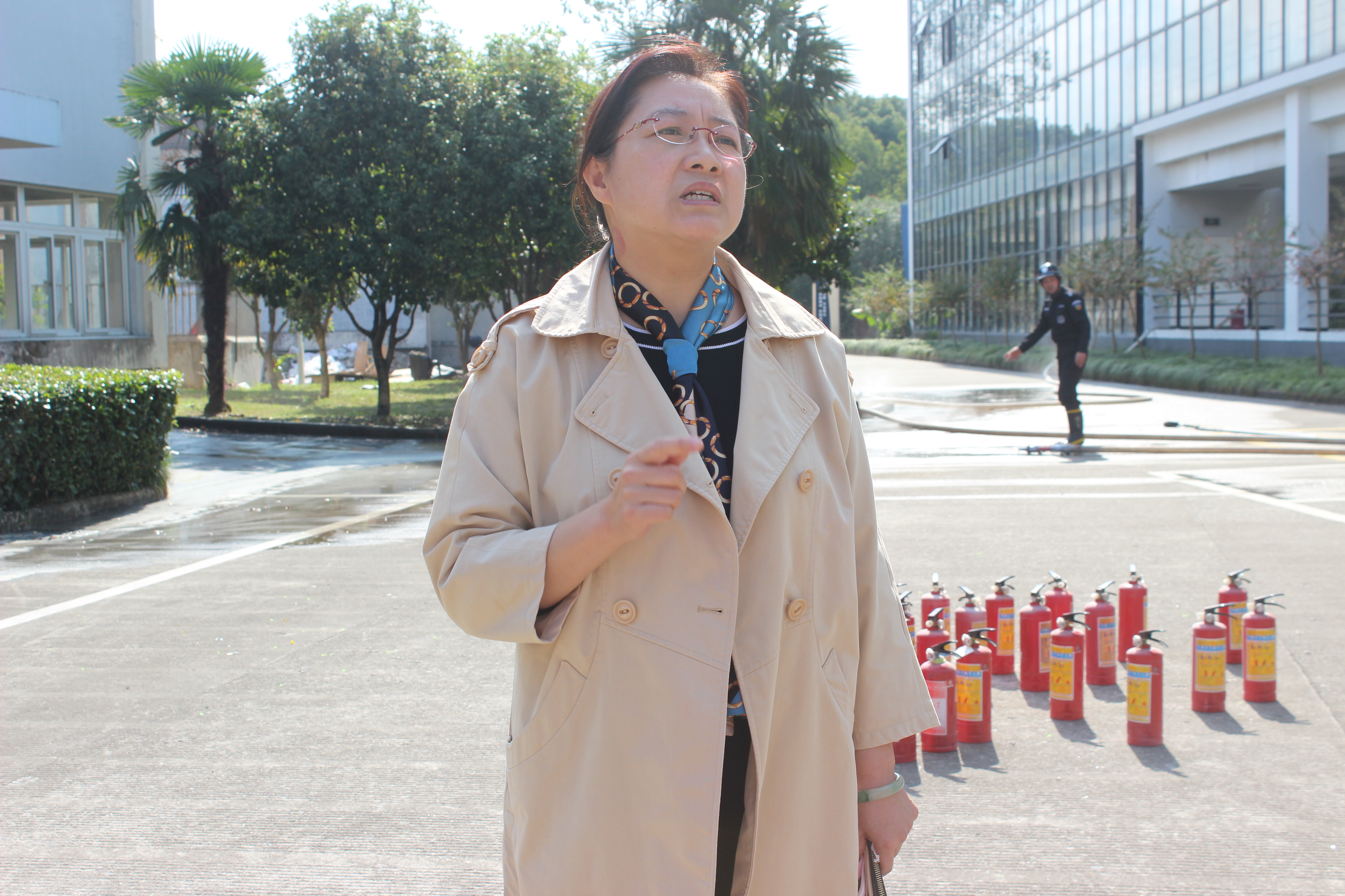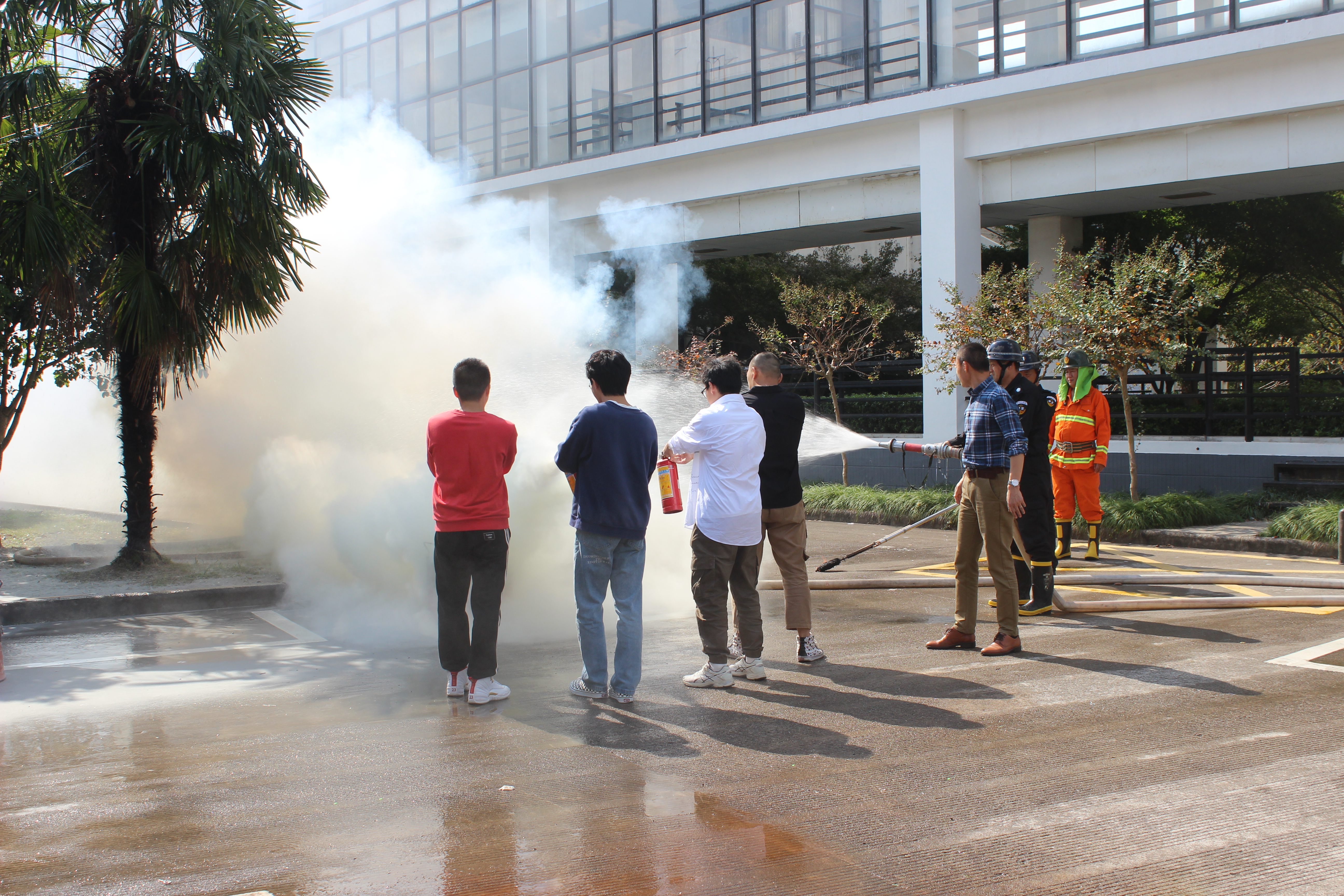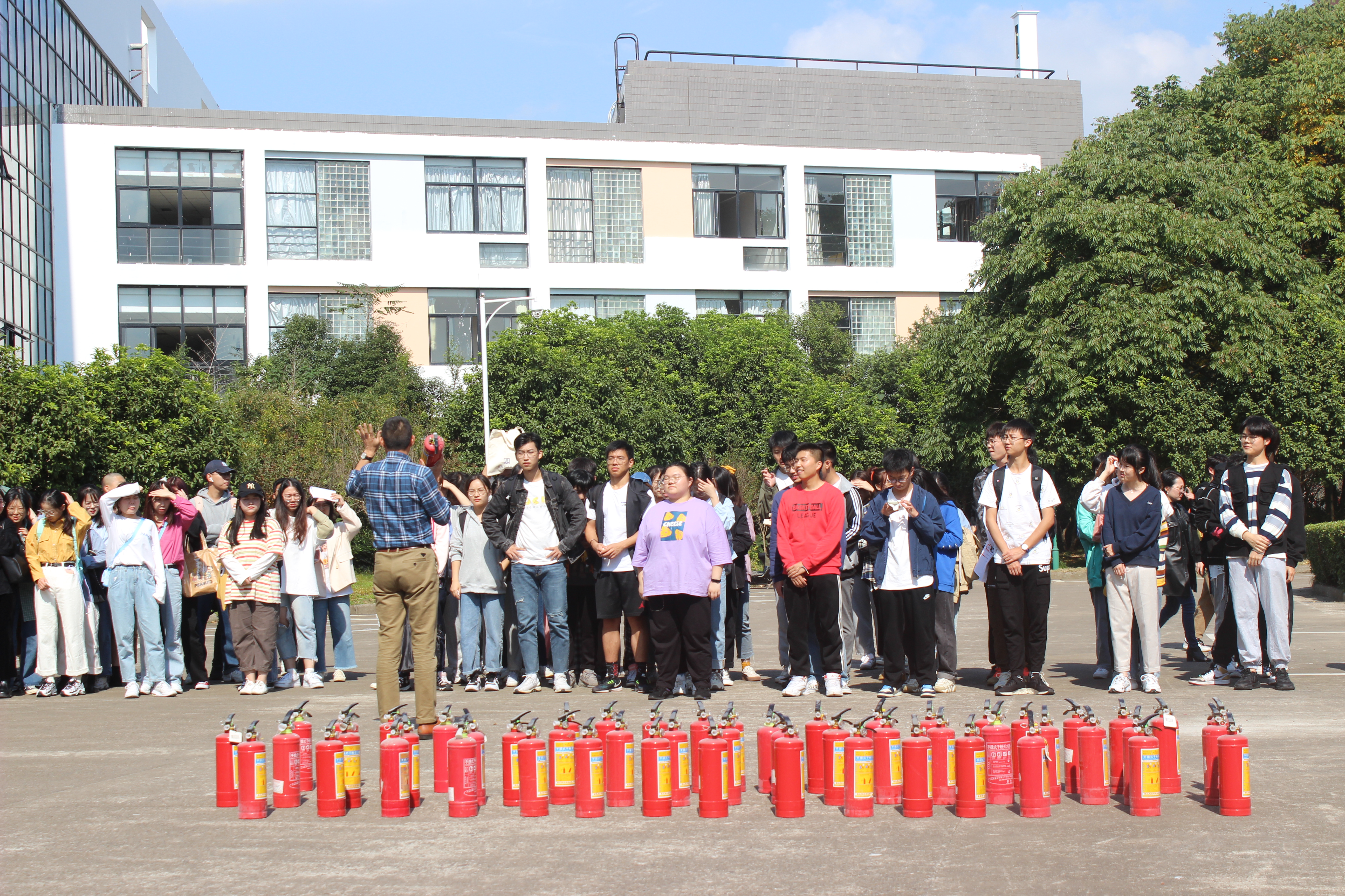 在演习之前,同学们于SC三楼大厅集合。随着一声令响,大家用湿纸巾捂住口鼻,弯腰小步快走,沿着逃生路线迅速、有序地撤离。师生们疏散至学校金工车间旁空地处继续开展消防演习。在演习教育过程中,燕永波老师教导大家如何正确使用灭火器,并且鼓励同学们进行实践操作。同学们纷纷上前尝试,积极参与其中。随后,朱小红老师总结讲话,指出干燥季节易引发火灾,若发生意外,要以自我安全为第一,保护好自己,才能更好地保护我们的校园。