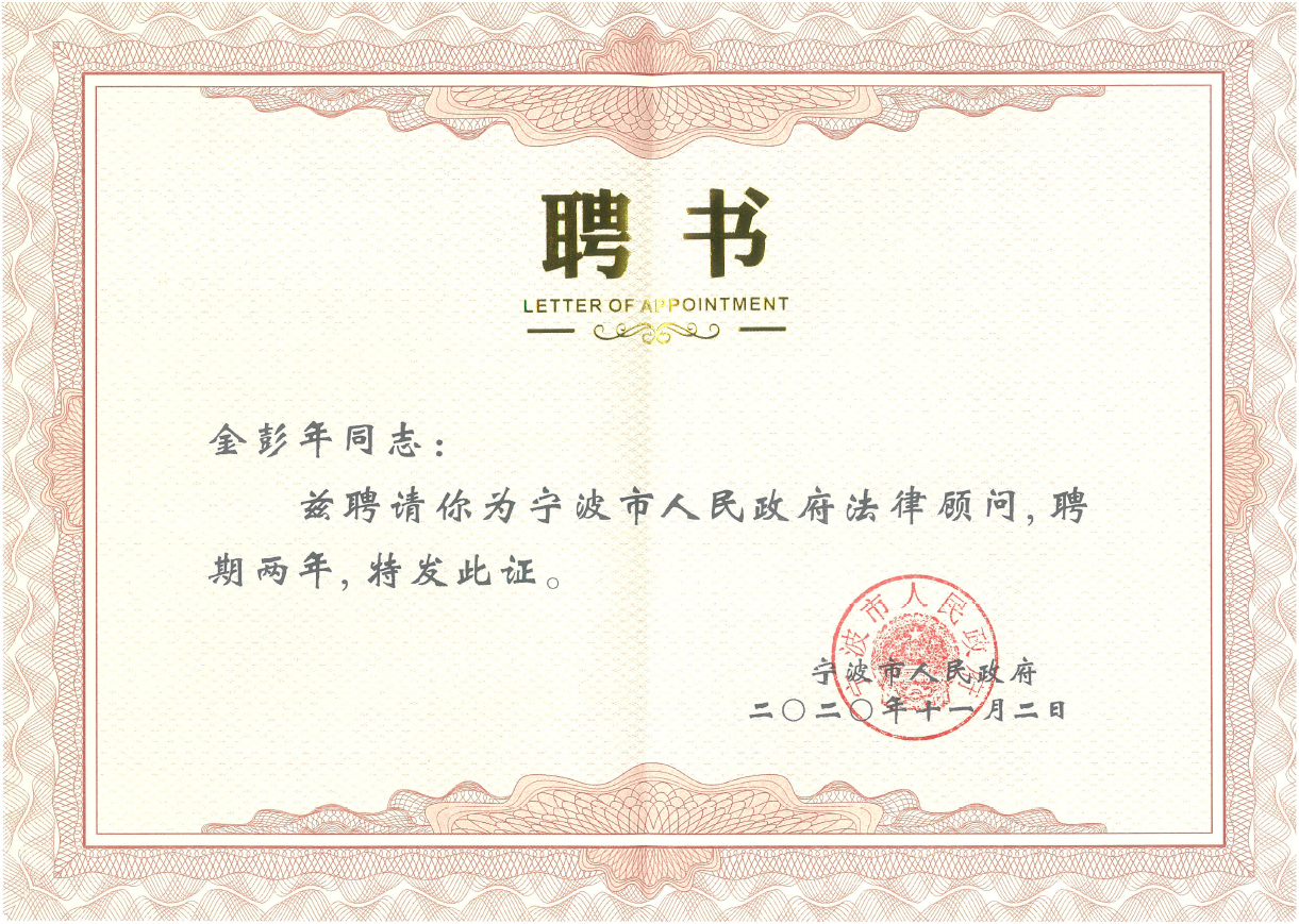 会议第一项议程,由市长裘东耀、常务副市长陈仲朝和市政府秘书长朱金茂给新一届宁波市人民政府法律顾问颁发聘书。我校传媒与法学院启新特聘教授、国务院政府特殊津贴专家,金彭年博士继续受聘宁波市人民政府法律顾问。。我校传媒与法学院启新特聘教授、国务院政府特殊津贴专家,金彭年博士继续受聘宁波市人民政府法律顾问。