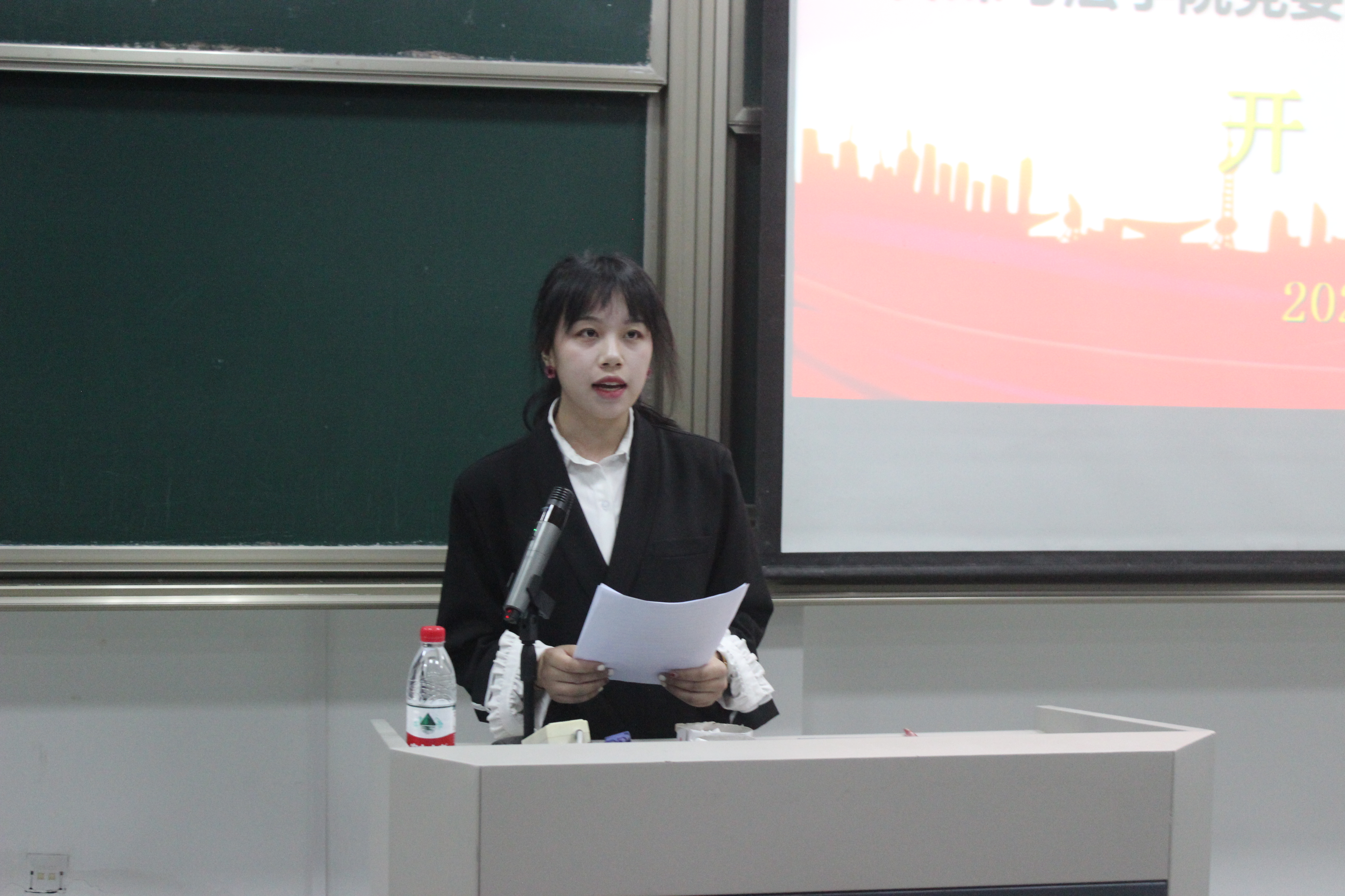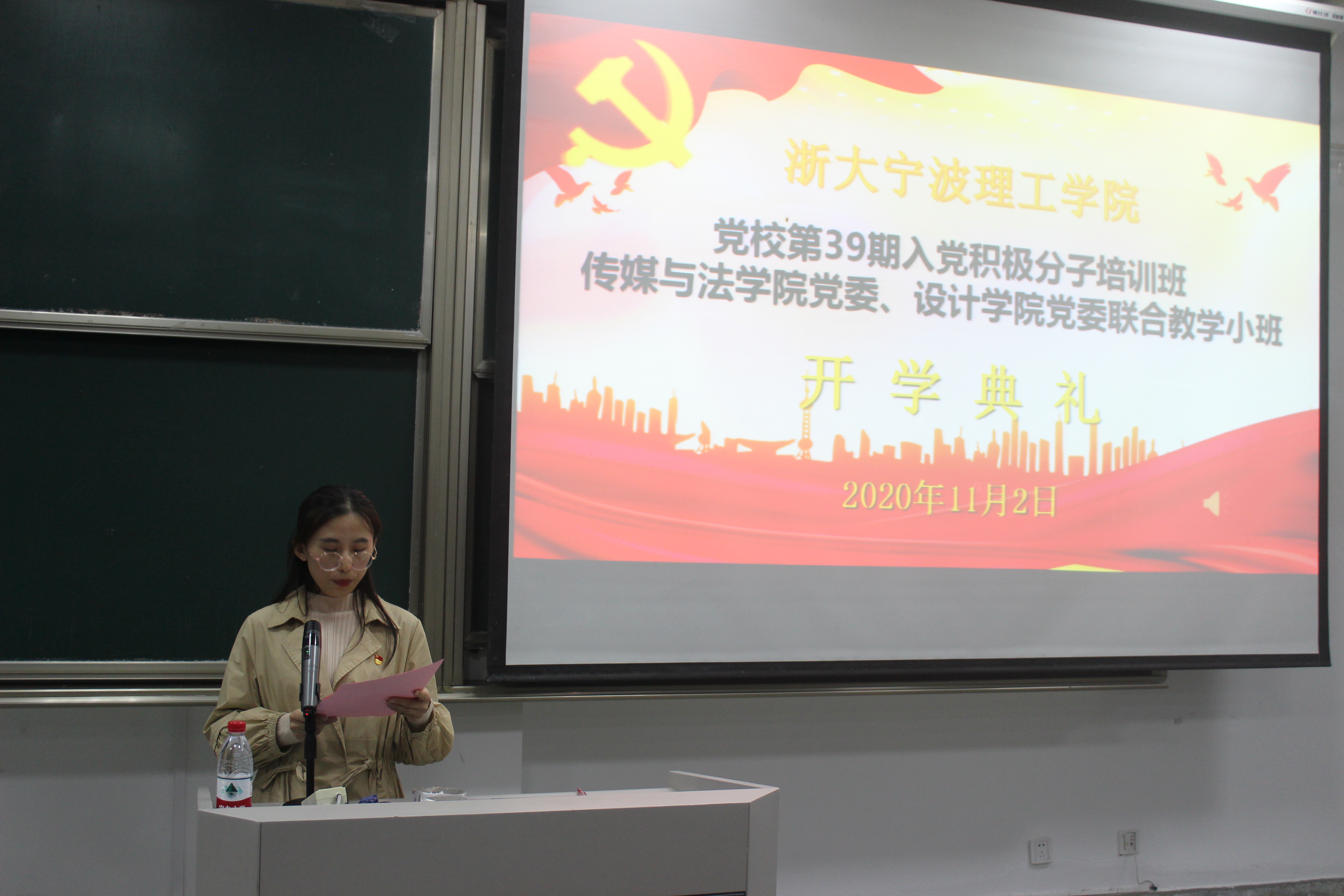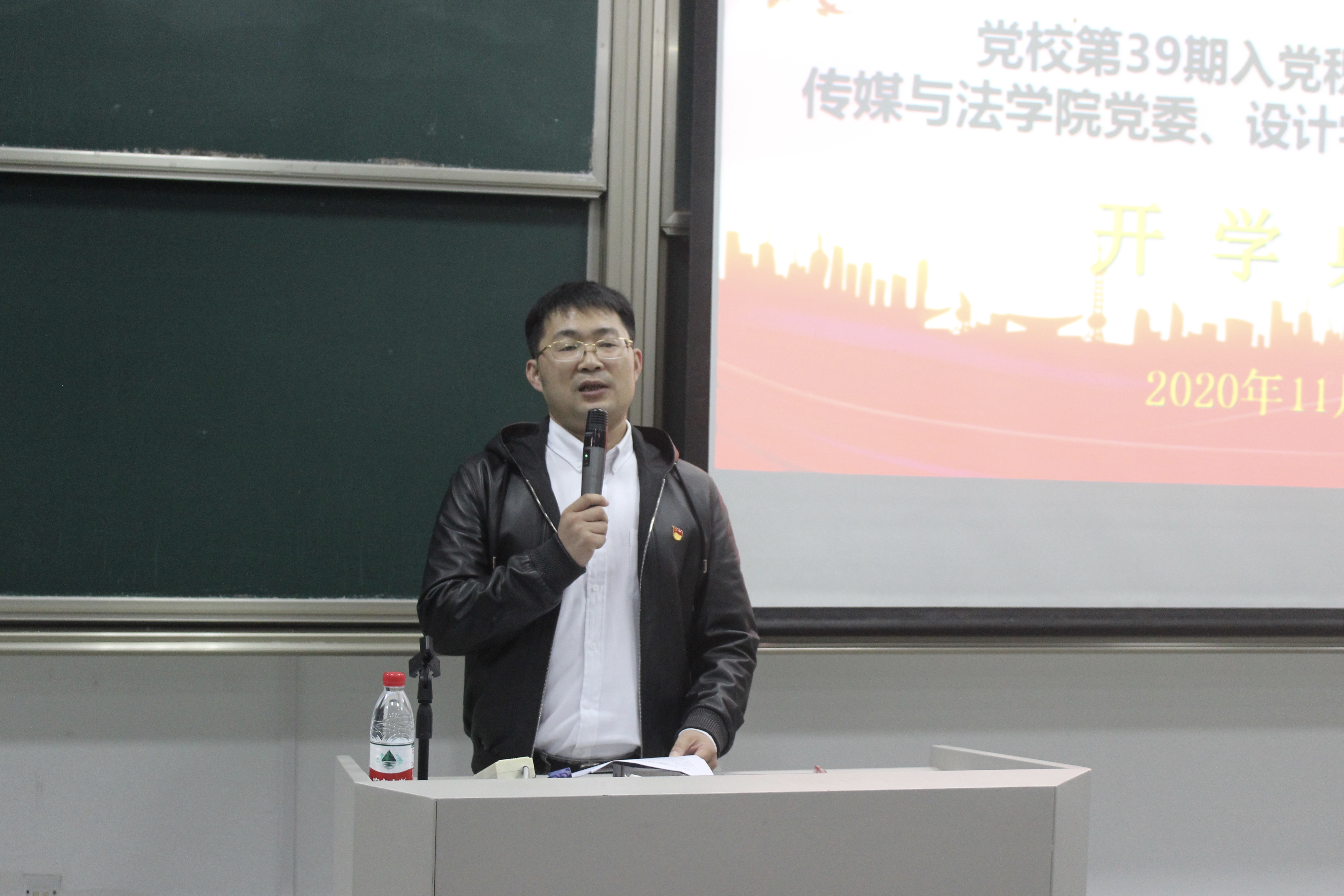 为进一步加强学生党员队伍建设,端正同学们的入党动机,树牢“四个意识”,坚定“四个自信”。在全国上下深入开展“四史”主题教育之际,11月2日晚上,党校第39期入党积极分子培训班设计学院党委、传媒与法学院党委联合教学小班开学典礼于SF106举行。设计学院党委书记吴春,传媒与法学院党委副书记、纪委书记胡鹿鸣,各学生支部老师赵红、邬旭东、董亚钊、刘舒、丁六申、李倩倩与88名学员参加开学典礼,典礼由设计学生支部副书记高雅姝主持。