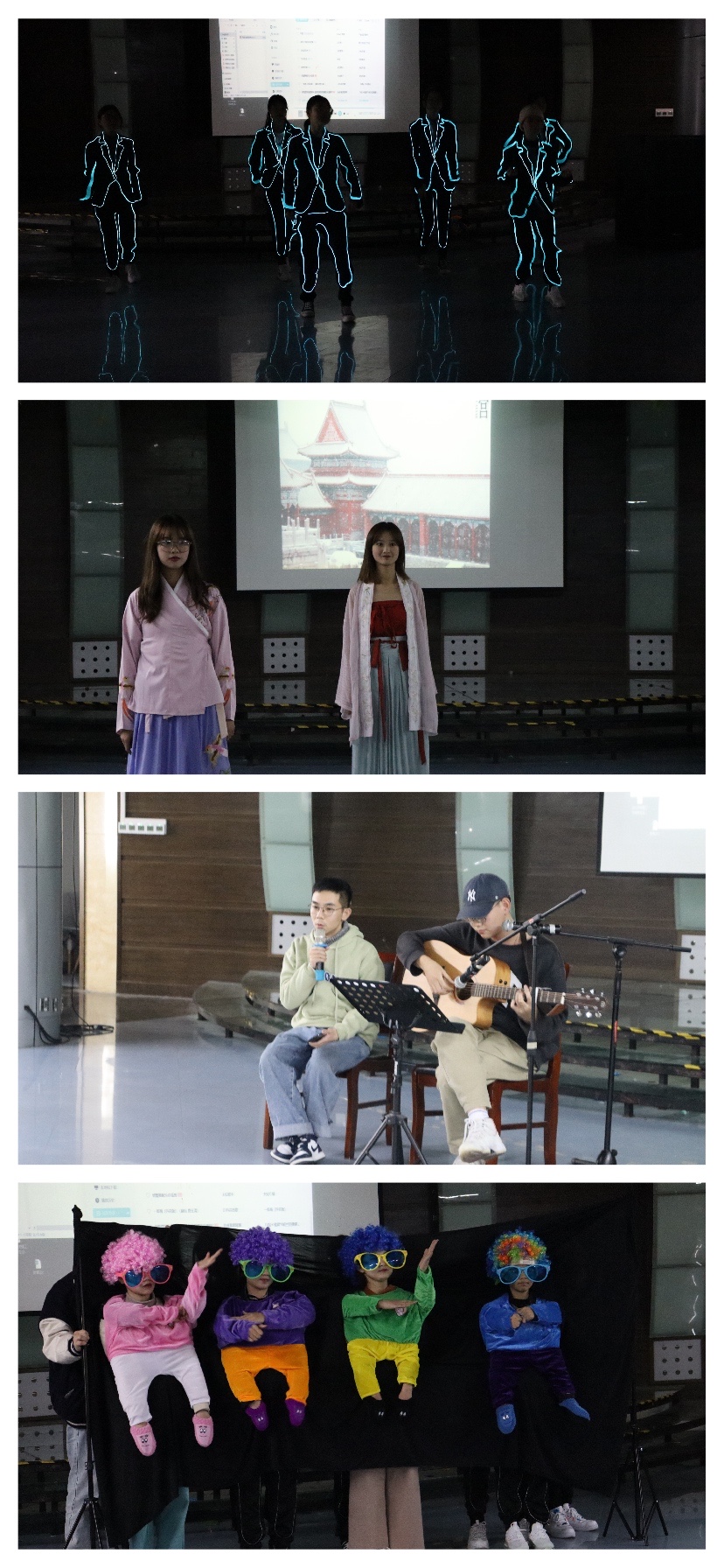 随着开场音乐奏响,现场气氛高涨,各班依次登台表演,以丰富多彩的形式展现青春活力。法学203班的同学们身着不同年代背景下的中国服饰,带来了一场《不“衣”YOUNG的走秀》,展现中国服饰变迁之美。网新202班诠释了一出别致风趣的《NIT快乐创造营》,表达青春的活力与激情,将现场氛围带入高潮。网新201班立足于新生离家、报道当天、新生运动会等经历,创作情景剧《幸运行星》;新闻专升本202班带来的吉他独奏、双人合唱民谣《那些花儿》,引发现场同学共鸣,余音袅袅,连绵不绝……大赛结束后,艺术团舞蹈队带来了舞蹈串烧,整齐划一的动作配上动感的音乐,迸发青春的激昂。话剧队表演了话剧《半截蜡烛》,形象生动的肢体表达以及巧妙的情节设计,展示出他们的独特魅力。最后,大赛在合唱队动听的歌声中落下了帷幕。