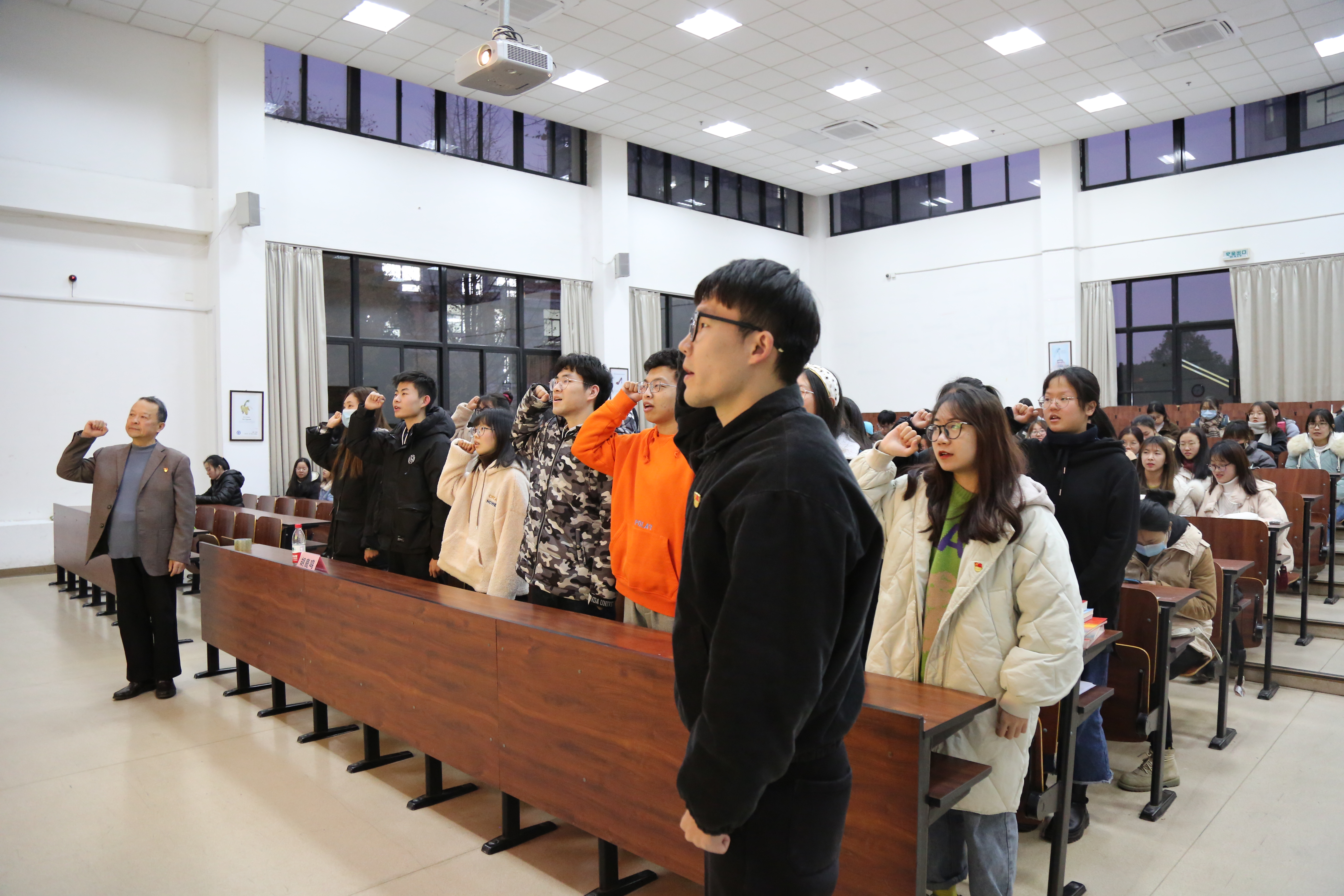新四军,是中国共产党直接领导的抗日武装力量,是中国人民解放军的前身之一,在抗日战争中,抗击和牵制了16万日军,23万伪军,作战2.2万余次。叶小湖从抗战时期的中国新四军开始讲起,阐述了当年新四军的作战历史,随后聚焦于抗战时期浙东新四军,展现了“听党指挥、执纪严明、维护团结、艰苦奋斗、不怕牺牲、服务人民”的新四军精神。“要勇于担当,率先垂范,关键时刻起好带头表率作用。”叶小湖表达了对同学们的殷殷期盼,鼓励大家从红色故事中汲取奋斗力量。随后,在热烈的掌声中,他还代表宁波新四军历史研究会向学院“红色书屋”捐赠书籍。聆听完红色故事,感受到红色精神的熏陶后,新发展的预备党员们面向党旗,庄严地进行了入党宣誓。在坚定的宣誓声中,不忘党员责任与义务,牢记党员初心与使命。