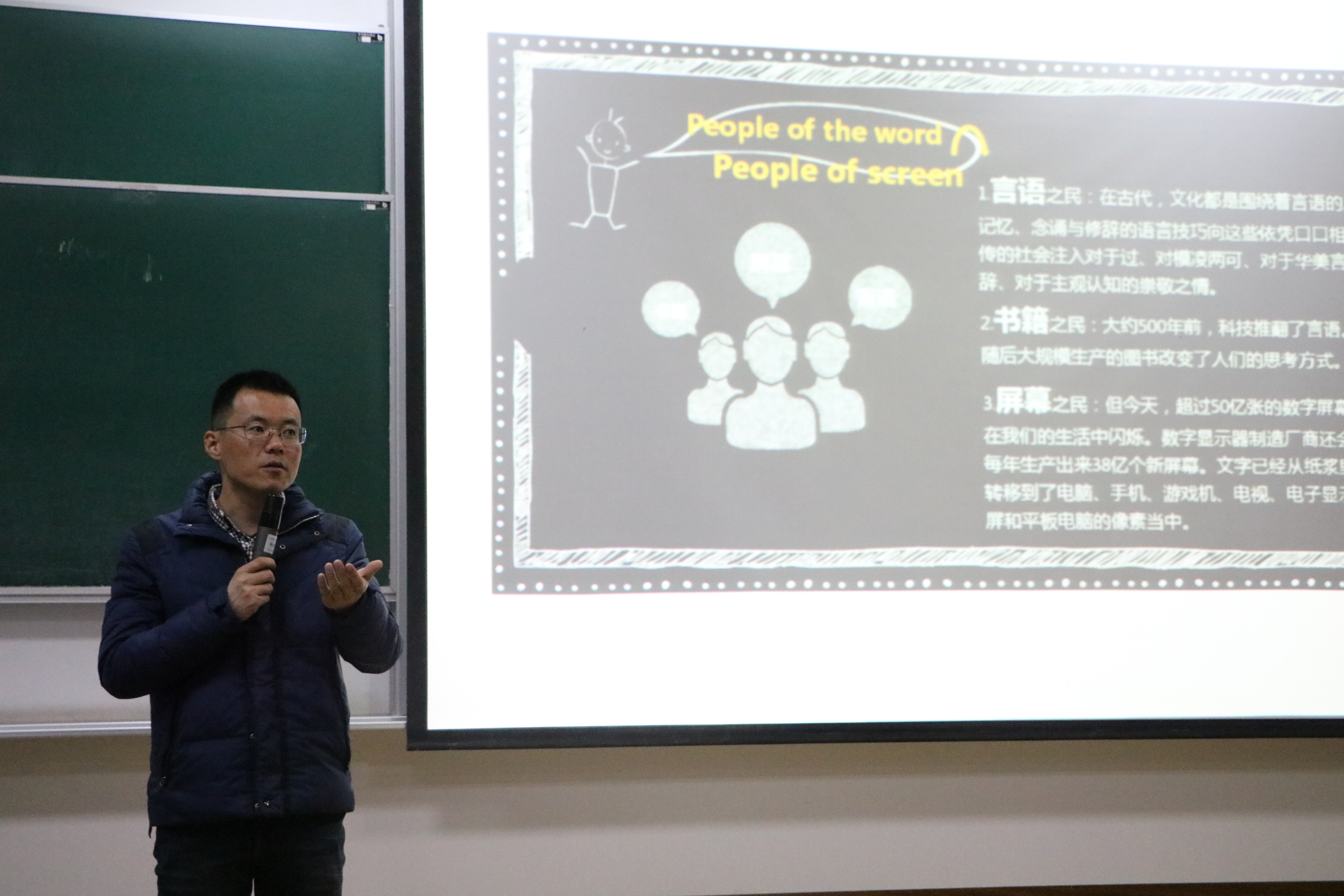 讲座从“历史视野下书与阅读的形态变迁”,“一个图书馆员的阅读史与阅读观”,“传法学院阅读力分析——图书馆的视角”,“在甬学生的‘四知精神’书单荐读”四个角度展开论述。讲座中,刘杰老师先提出了“书是什么”的问题,随后顺着历史的长河,对于阅读形态的变化做了系统的讲述。之后,针对“书的定义”,“读是什么”,“屏读与纸读的区别”,“人类为什么要阅读”等问题进行了展开。在讲座中,刘杰老师也分享了自己的读书经历与读书经验,其中更是穿插讲述了自己的阅读观。最后,刘杰老师用数据展示了阅读与传媒与法学院的渊源之深,并且将阅读与每一个学生个体密切联系了起来。刘杰老师的讲座内容丰富,并且在讲座的过程中,举出多个生动的例子,让这些问题的答案更为生动形象,深入人心。这次的讲座让同学们更清楚,更系统的了解了阅读的发展历程,不同的阅读方式带来的影响,以及阅读的重要性,可谓是受益颇丰。