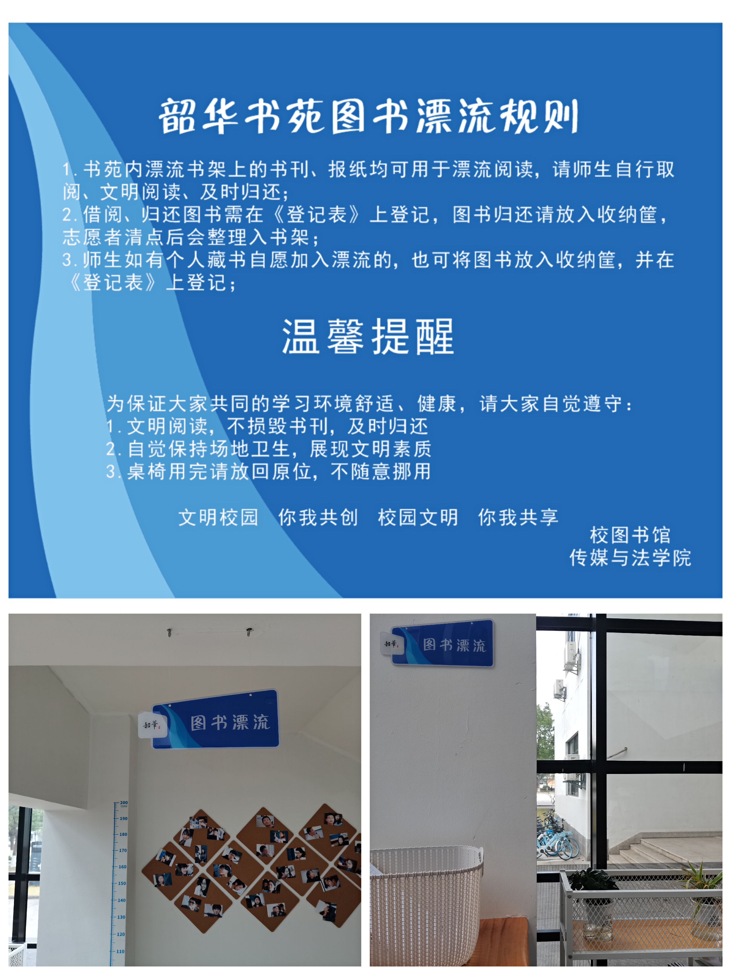 2020年9月,传媒与法学院将SC教学区一楼楼梯间改造成为集读书、休闲为一体的韶华书苑。2021年新年伊始,传媒与法学院开展韶华书苑图书漂流活动,为学校书香文化建设继续添砖加瓦。