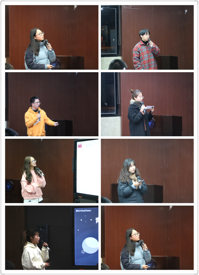 会议伊始,各部门的干部代表结合PPT对部门一学期工作进行总结,主要围绕部门建设、工作成果、工作特色、不足与展望等几个方面。其中,学联心理部回顾了过去一年中部门负责的主要事项,如疫情期间心理小票的审核、学院新成立后相关细则的完善等,展现了在遇到问题时部门成员齐心协力、积极思考、砥砺前行。团委青媒中心影视部针对部门工作中所发现的问题提出了相关的解决措施,例如录制钉钉课程对部门成员进行统一的视频技术教学,并且布置了相应的工作来锻炼和提升拍摄水平,此外,部门还发起了每日英语学习打卡活动等。团委青协志愿者部在继续做好宁波博物馆、图书馆和城市展览厅的文明劝导志愿服务工作的基础上,创新思维开展了“祝福冬至,平安宁理”活动,传递志愿者精神,为校园增添暖意……部门代表们激情澎湃的讲述赢得现场阵阵掌声,展现出了传媒与法团学的风采。团委书记曲昊杨在最后的讲话中表达了对团学各部门工作的肯定和对同学们辛苦付出的感谢,也阐述了下学期团学的发展规划,指出团学工作要立足时代背景,契合学校、学院发展节点,贴近同学,服务同学;团学成员要注重完善自我,更好地成长成才。