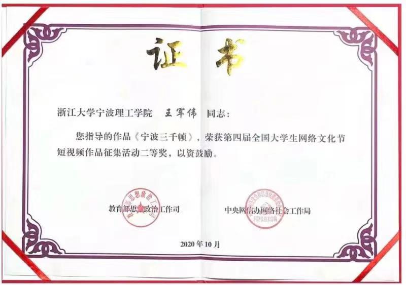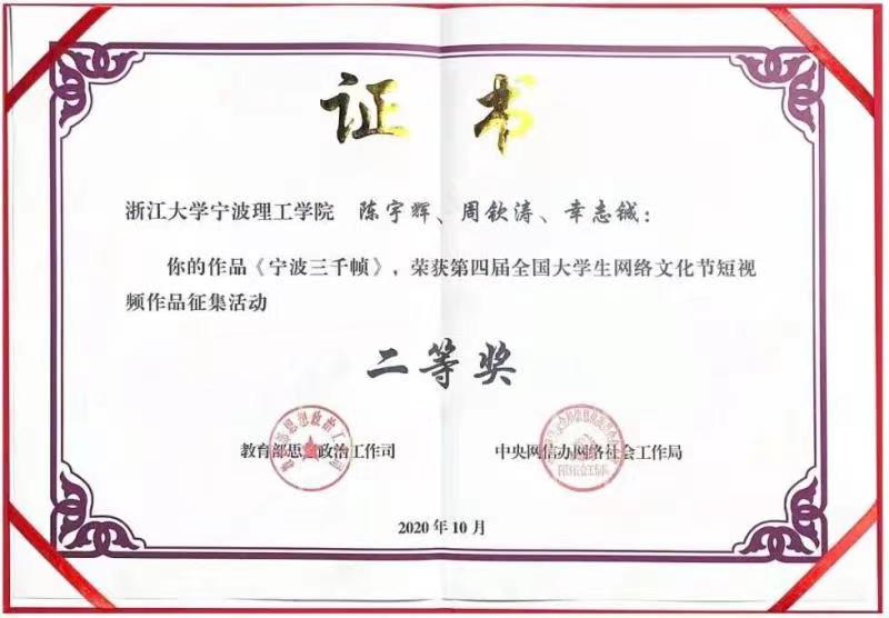 近日,传媒与法学院传来喜讯,由学院学子陈宇辉、周钦涛和土木建筑工程学院幸志铖组成的团队(指导老师:王军伟)凭借作品《宁波三千帧》获得了第四届全国大学生网络文化节短视频作品征集活动二等奖。