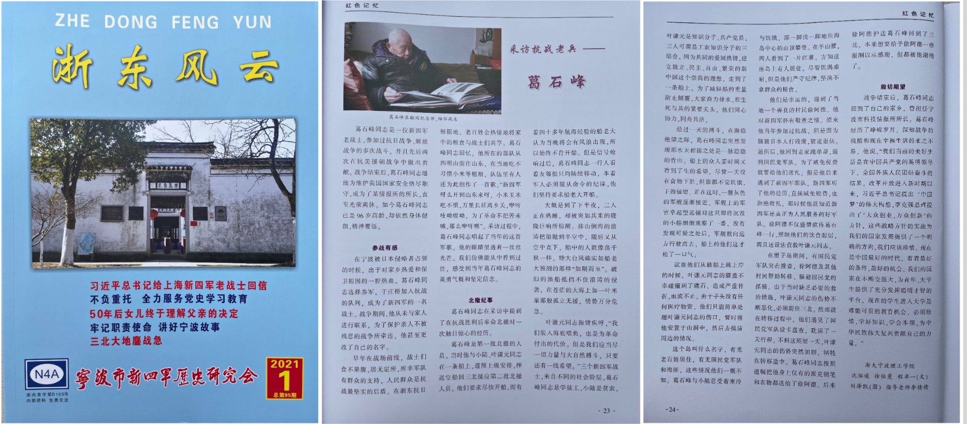 《采访抗战老兵葛石峰》一文在《浙东风云》刊发,旨在把葛石峰同志的这份英勇气概和坚定信念传递给青年一代。通过倾听抗战老兵讲述历史与学习党史相结合,进一步感悟思想伟力。立足中国共产党成立100周年的重大时刻,进一步发扬革命精神,始终保持艰苦奋斗的昂扬精神,教育引导青年学子感悟红色记忆,发扬红色传统,传承红色基因,始终为实现中华民族伟大复兴而不断奋斗。