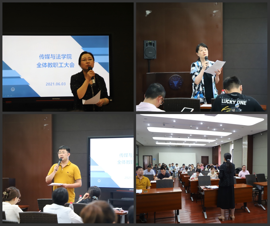 6月3日中午,传媒与法学院召开了全体教职工会议。会议由党委委员、副院长韩缨主持,全体教职工参加。