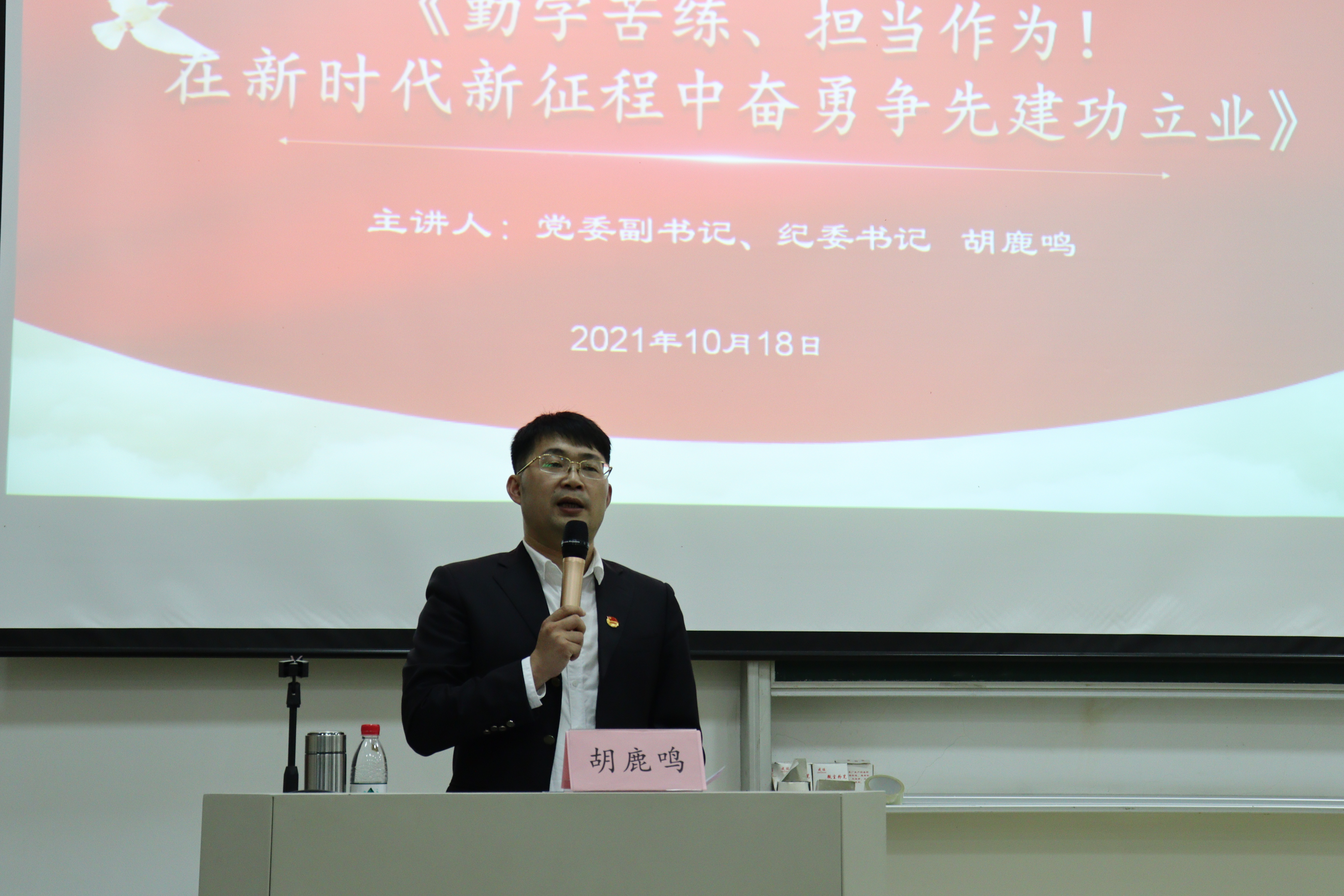 胡鹿鸣老师本次团课以《勤学苦练、担当作为!在新时代新征程中奋勇争先建功立业!》为题,引经据典,着重从四个方面就如何“勤学苦练、担当作为”提出了对青年学生干部的希望:一、青年学生干部要讲政治,坚定不移跟党走;二、青年学生干部要在岗位上勤学苦练,练就真本领;三、青年学生干部要事不避难、义不逃责,担当作为;四、青年学生干部要多读书、善于学习。