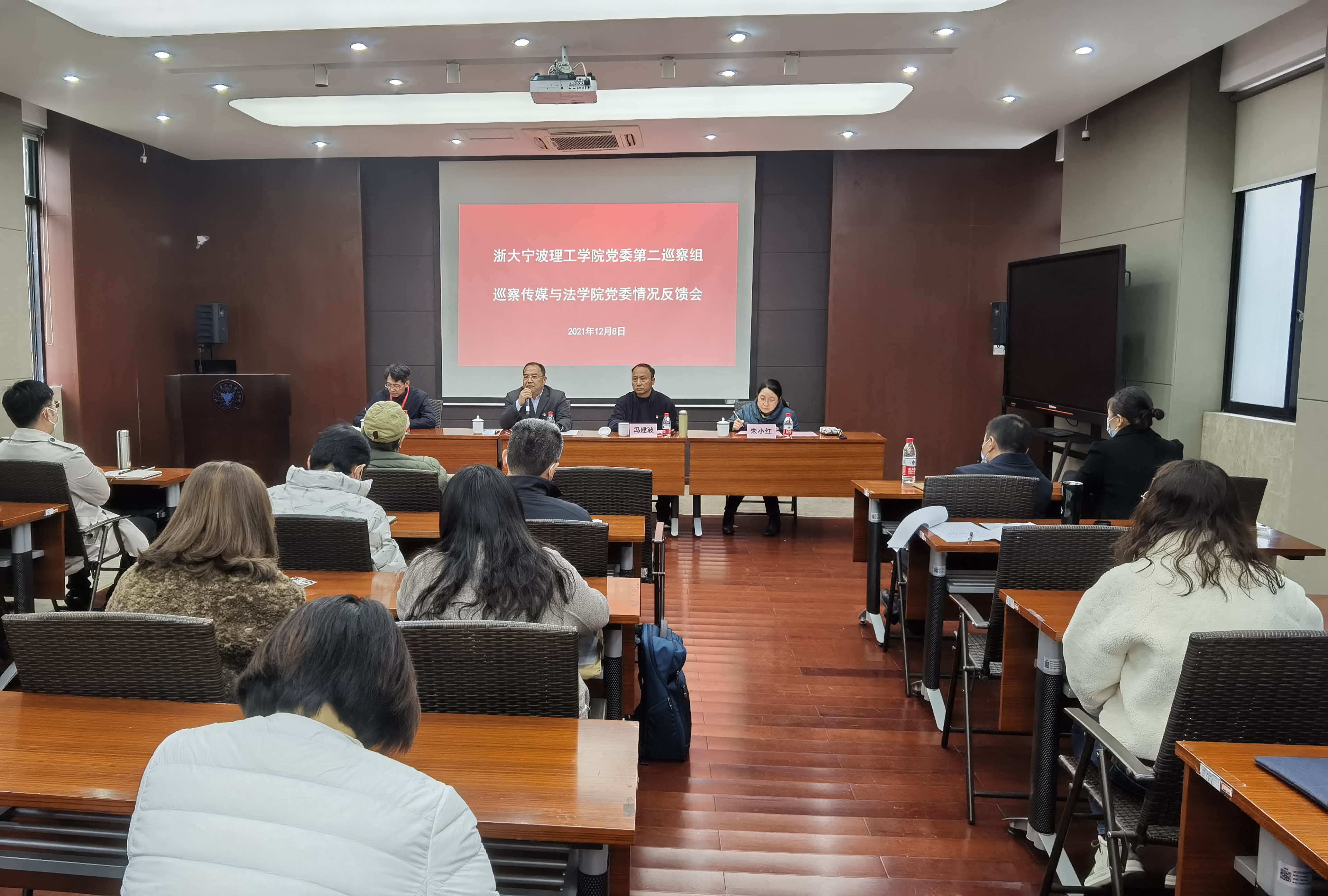 冯建波代表第二巡察组作巡察情况反馈。他指出,2017年以来,传媒与法学院党委坚持以习近平新时代中国特色社会主义思想为指导,把党的政治建设摆在首位,不断增强“四个意识”、坚定“四个自信”、做到“两个维护”,贯彻党的教育方针,落实省、市、校各级党委要求,学院事业发展取得成效。党建引领有典型,党员、教师、青年中获浙江省“三育人”先进个人1人、浙江省“百强团支部”1个、宁波市优秀教师1人、宁波市战疫一线表现突出青年1人。学科建设有成效,传播学获批浙江省重点学科,新闻学获批宁波市重点学科、特色专业,网络与新媒体专业入选浙江省“十三五”优势特色专业、浙江省一流专业、宁波市第四批优势特色专业,新增联合打造浙江历史文化研究中心等学科交叉平台2个。实践育人有亮点,连续14年打造“行走的新闻”实践育人品牌,出版作品19本,获团中央回信,省、市及浙江大学校领导批示肯定。但在巡察中也发现了一些问题,主要是:贯彻落实党的理论路线方针政策和党中央决策部署不到位;落实立德树人根本任务不扎实;党委政治核心作用发挥不充分;意识形态工作存在薄弱环节;党管人才的作用发挥不够有力;落实全面从严治党主体责任不到位;为民服务的宗旨意识不牢固;重点领域、关键环节的廉政风险防控不到位;师德师风建设不够有力;党内政治生活不够严肃;议事决策机制运行不规范、执行不到位;基层组织建设不够规范;党支部战斗堡垒作用和党员锋领作用发挥不够充分;对“不忘初心、牢记使命”主题教育检视发现问题的整改落实不到位;对学校专项督查整改落实不到位。