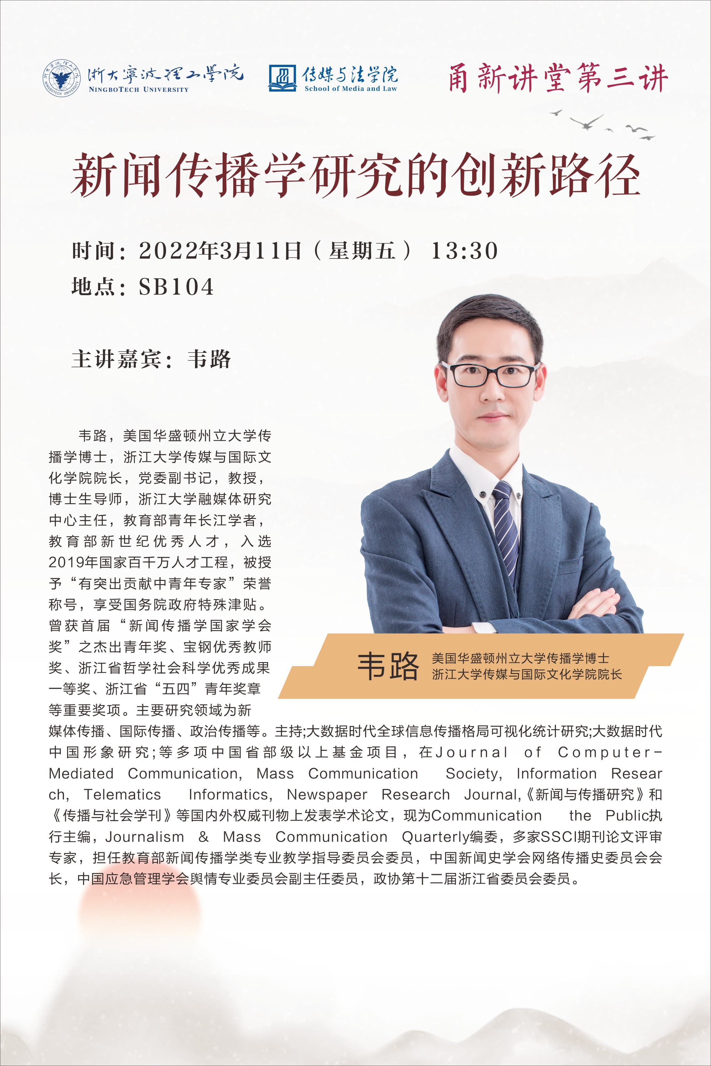 主讲嘉宾简介:韦路,美国华盛顿州立大学传播学博士,浙江大学传媒与国际文化学院院长,党委副书记,教授,博士生导师,浙江大学融媒体研究中心主任,教育部青年长江学者,教育部新世纪优秀人才,入选2019年国家百千万人才工程,被授予“有突出贡献中青年专家”荣誉称号,享受国务院政府特殊津贴。曾获首届“新闻传播学国家学会奖”之杰出青年奖、宝钢优秀教师奖、浙江省哲学社会科学优秀成果一等奖、浙江省“五四”青年奖章等重要奖项。主要研究领域为新媒体传播、国际传播、政治传播等。主持;大数据时代全球信息传播格局可视化统计研究;大数据时代中国形象研究;等多项中国省部级以上基金项目,在Journal of Computer-Mediated Communication, Mass Communication Society, Information Research, Telematics Informatics, Newspaper Research Journal,《新闻与传播研究》和《传播与社会学刊》等国内外权威刊物上发表学术论文,现为Communication the Public执行主编,Journalism & Mass Communication Quarterly编委,多家SSCI期刊论文评审专家,担任教育部新闻传播学类专业教学指导委员会委员,中国新闻史学会网络传播史委员会会长,中国应急管理学会舆情专业委员会副主任委员,政协第十二届浙江省委员会委员。