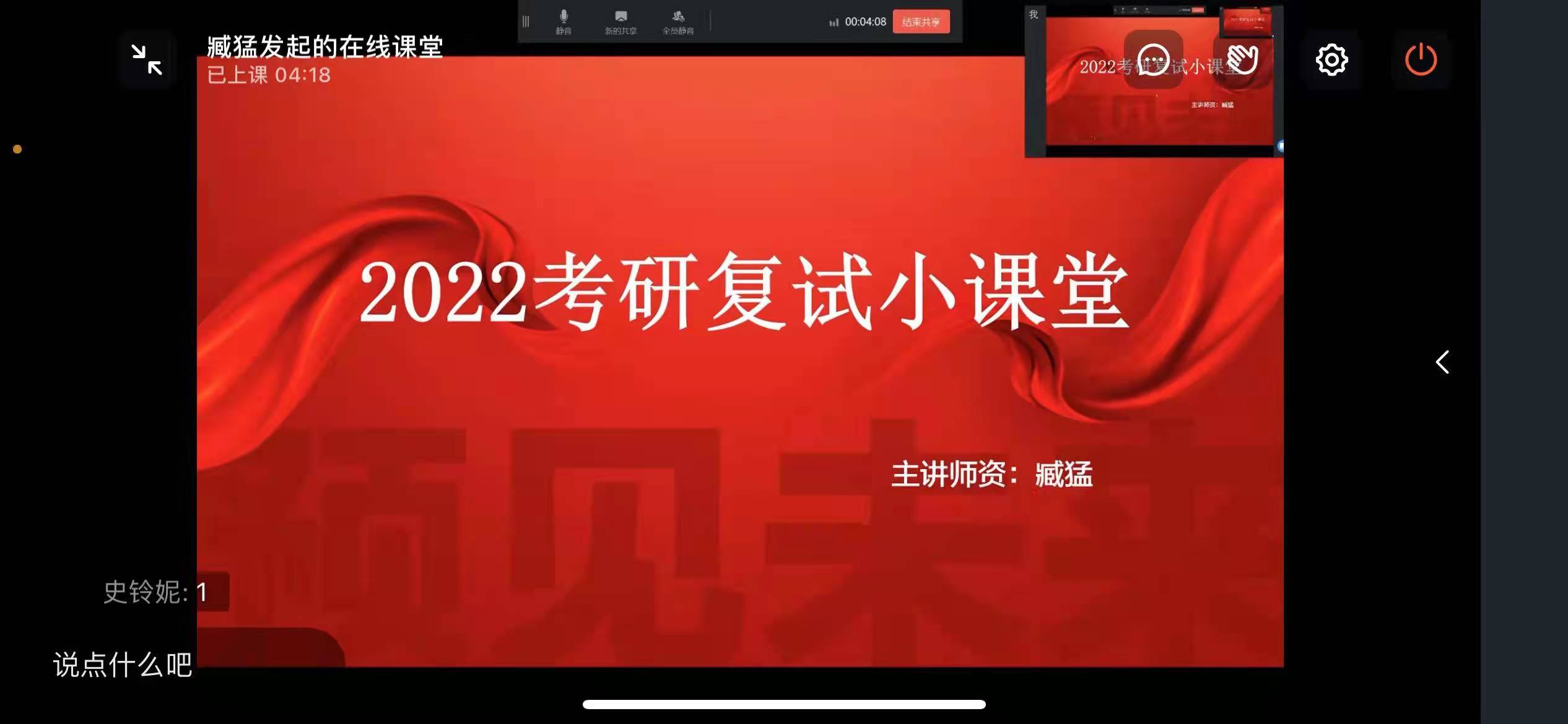 臧猛老师从复试、调剂、复试准备和复试必知这四个方面进行讲座,向同学们传授考研复试相关经验。首先,臧老师从复试内容、复试比例和复试意义进行解释说明,复试考察内容主要是专业能力、外语能力、综合能力等几个方面;其次,进行关于调剂的相关政策解读,指导同学们如何提高调剂成功率;紧接着,在复试准备方面,臧老师讲解了面试的相关要点,分析了面试主要考察考生的自我认知、人际关系、专业素质、政治素质,提醒同学们在面试时,要正面回应,明确观点,并深入阐述,并指导同学们如何在线上面试中取得高分;最后,对于复试必知做出了全面总结,再次对讲座的关键内容进行强调。