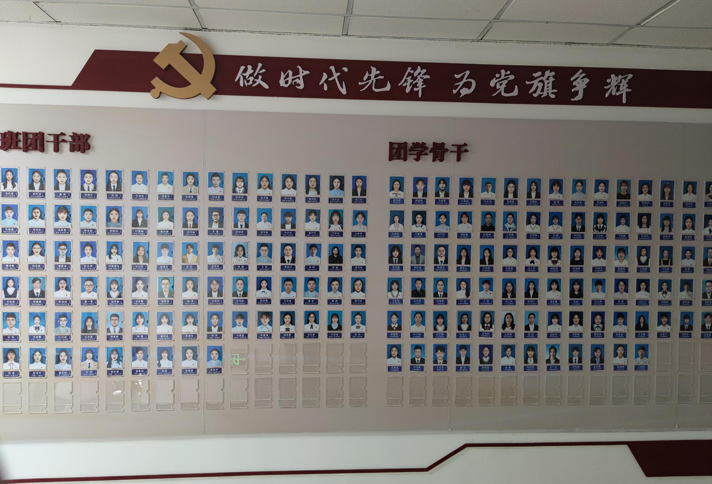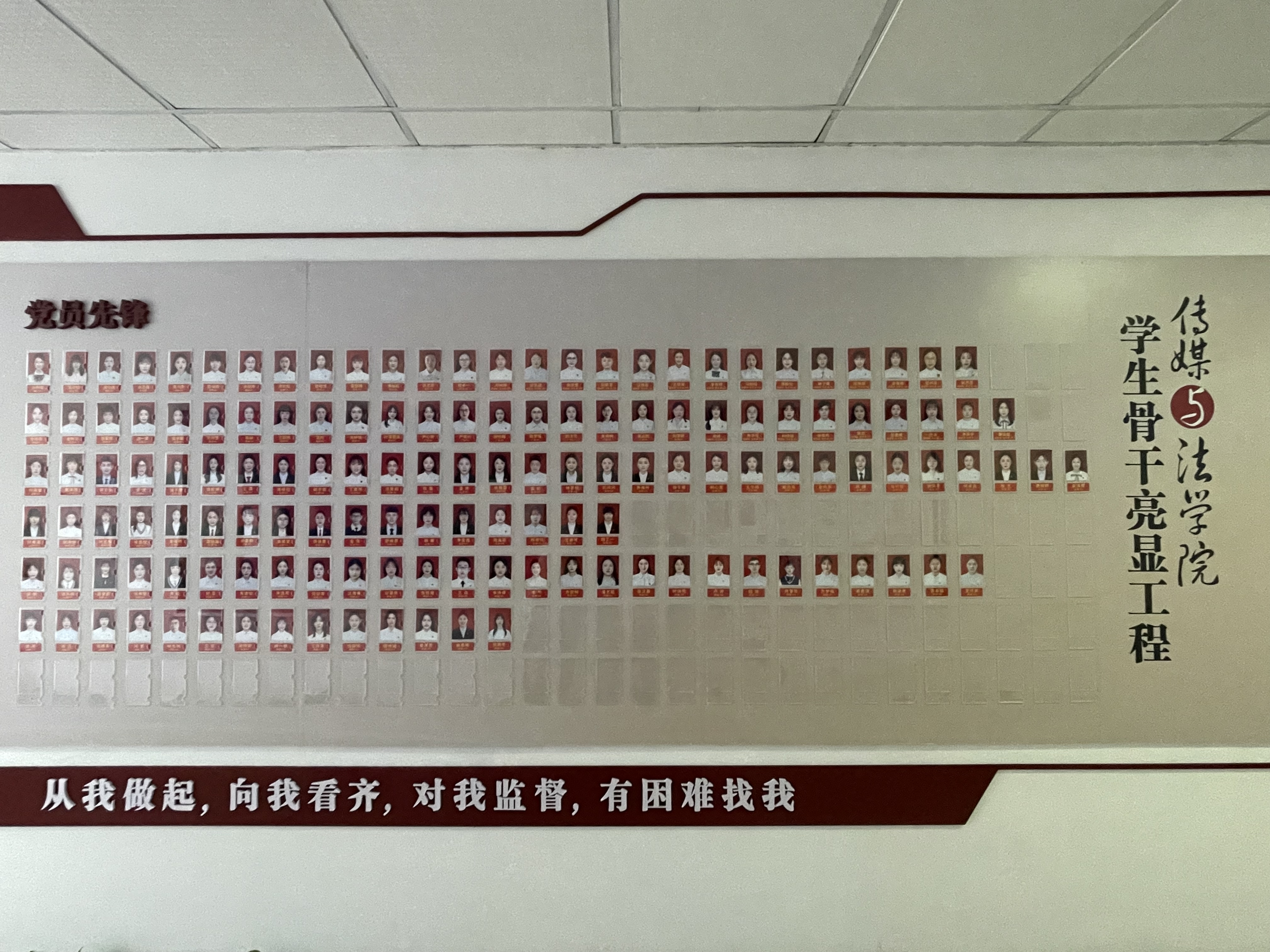 走进传媒与法学院位于SC3楼的办公区,一条长廊格外醒目,这里设有学生骨干亮显墙,展示了全体学生党员、学生骨干的信息。作为学院“三亮三比三评”活动的一部分,传媒与法学院充分利用众多载体和平台,开展了学生骨干亮显工程,在学院公示栏公开学生骨干的姓名、照片和班级,搭建了党员之家活动阵地,丰富学院党建文化墙,在学生党员宿舍张贴“党员宿舍”标识牌,在党员书桌张贴“我是党员,从我做起,向我看齐,对我监督,有困难找我”口号,鼓励学生骨干在学习生活期间,佩戴党员徽章、团徽。通过制度上墙、规矩上墙、荣誉上墙等方式,让学生骨干由“隐”到“显”、“亮出身份”,让每一位学生骨干亮相亮职责,既展示风采又接受师生共同监督。