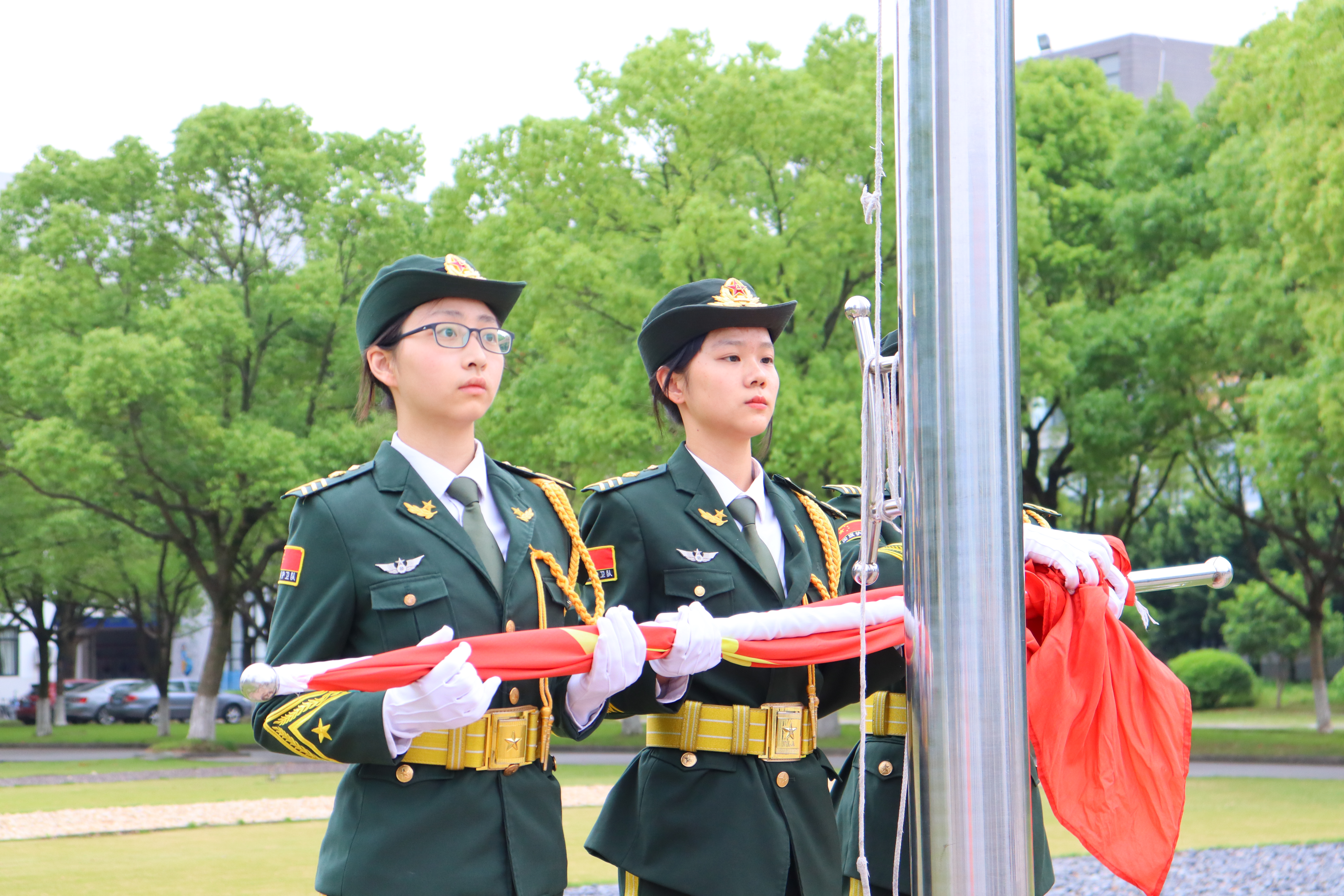 旗迎朝露,共沐晨光。国旗护卫队成员身着军装,齐步前进,护卫着五星红旗入场。全体师生肃立,齐唱国歌,鲜艳的五星红旗随风飘扬,标志着本次仪式正式开始。