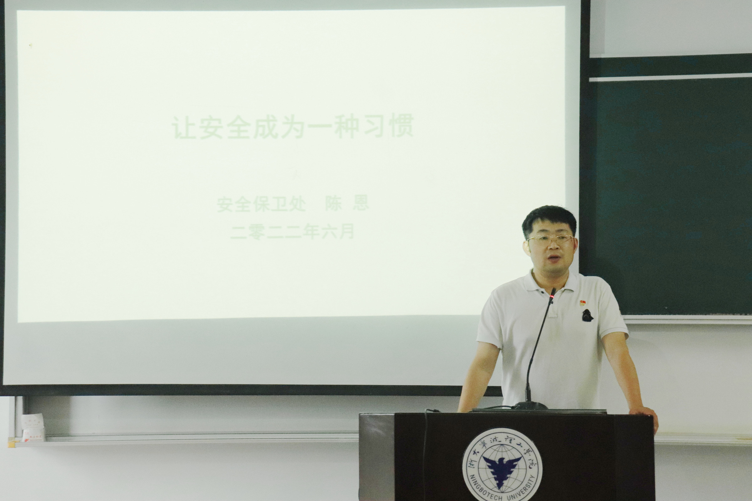 6月10日下午,为助力文明校园建设,护航校园安全,传媒与法学院特邀保卫处副处长、保卫部党支部书记陈恩为同学们开展安全讲座。本次讲座也是安全保卫处(安全保卫部)党支部与法学学生党支部结对共建的特色党日活动。党委副书记、纪委书记胡鹿鸣,思政主管曲昊杨,法学学生党支部书记李倩倩,辅导员杨潮以及学院各班班长、法学学生党支部全体党员线下参加此次会议,学院全体寝室长线上参加。