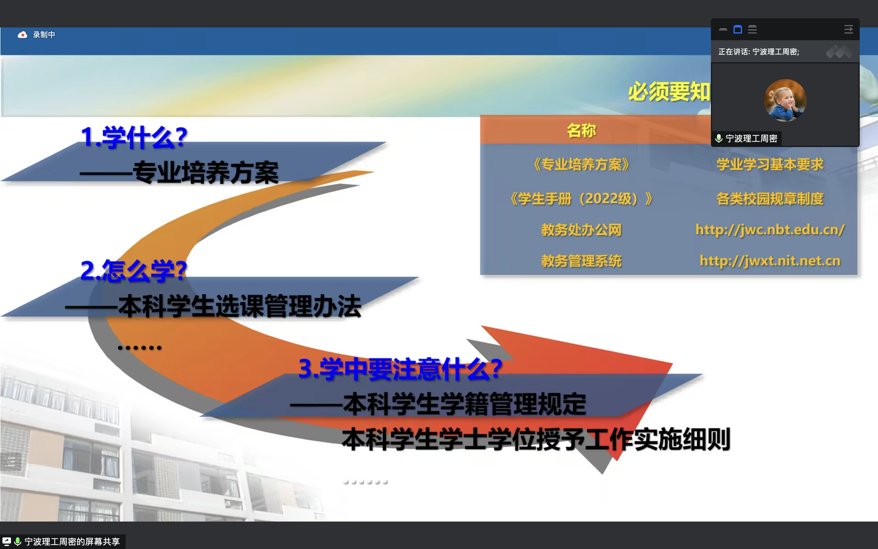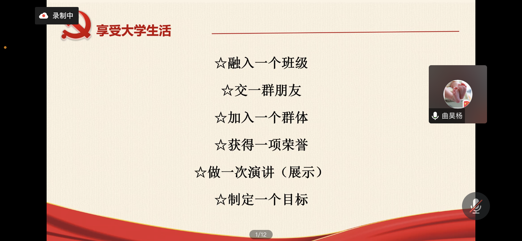 曲昊杨老师介绍了学院学工办的基本情况以及学生日常管理相关的规章制度,主要从请假流程、疫情防控相关要求、违纪处分、学生公寓管理等方面展开介绍。强调了大一新生作为一名学生,一定要守好学生底线,遵守学校规章制度。最后,曲昊杨老师鼓励同学们在大学学习生活中做到六个“一”,即融入一个班级、交一群朋友、加入一个群体、获得一项荣誉、做一次展示、制定一个目标。