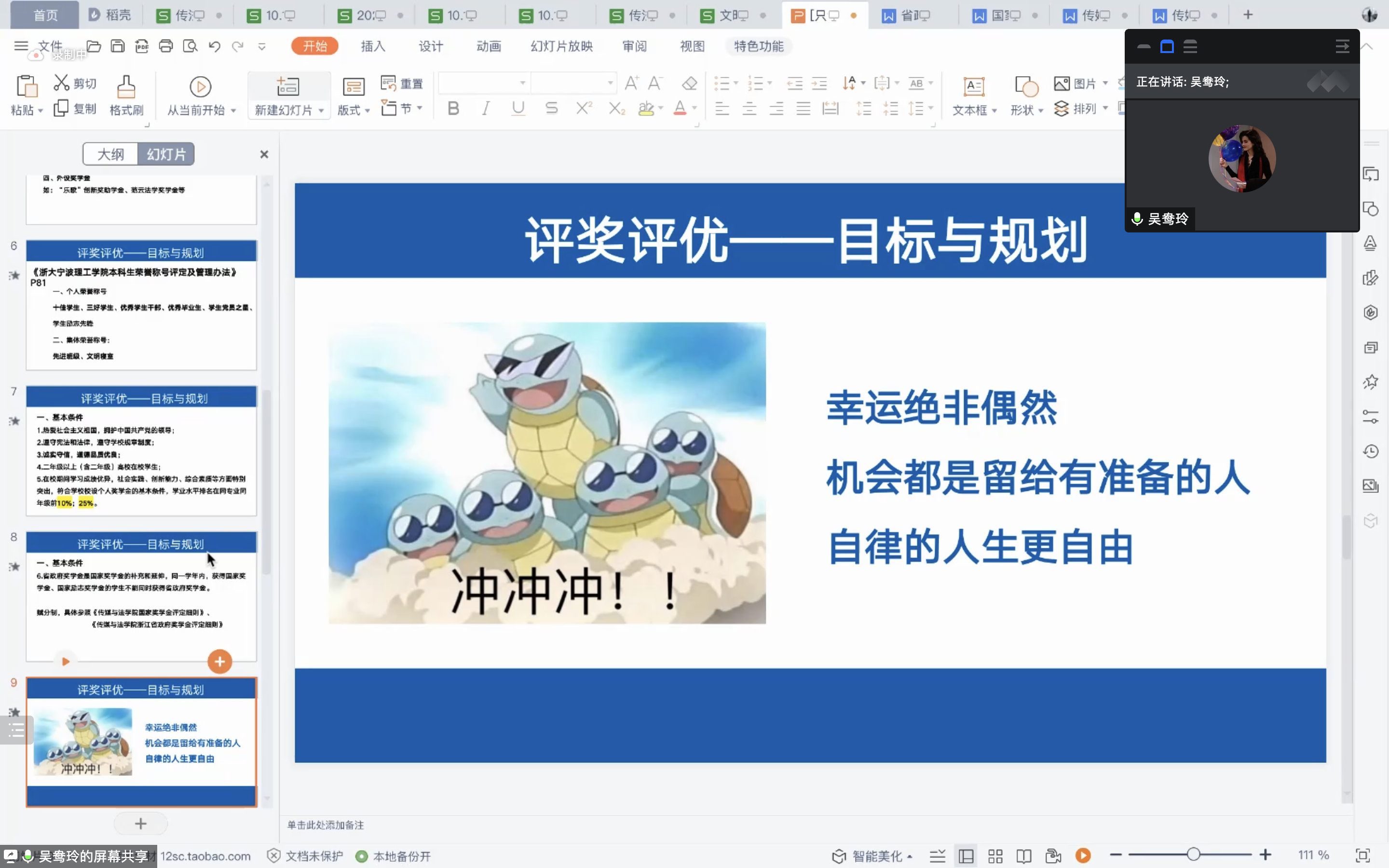吴鸯玲老师介绍了评奖评优的相关规章制度,分别介绍了校设个人奖学金——“求是奖学金”“学业奖学金”“专项奖学金”和“新生奖学金”、团体奖学金、本科生荣誉称号以及省政府奖学金的评奖要求和基本条件。吴鸯玲老师从学校相关规定、往年评选情况以及评奖评优注意事项给新生进行了讲解。最后,吴鸯玲老师提醒大一新生“幸运绝非偶然,机会都是留给有准备的人。”