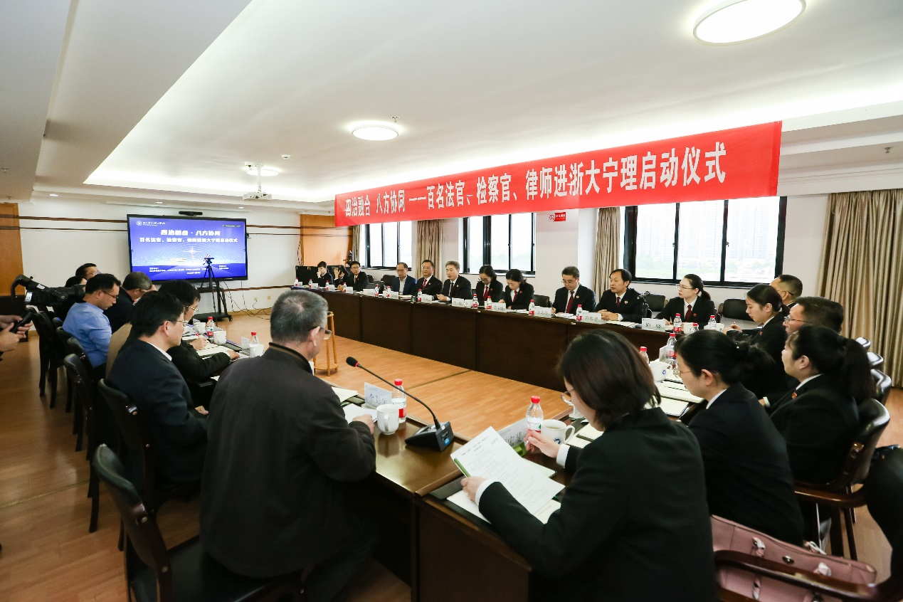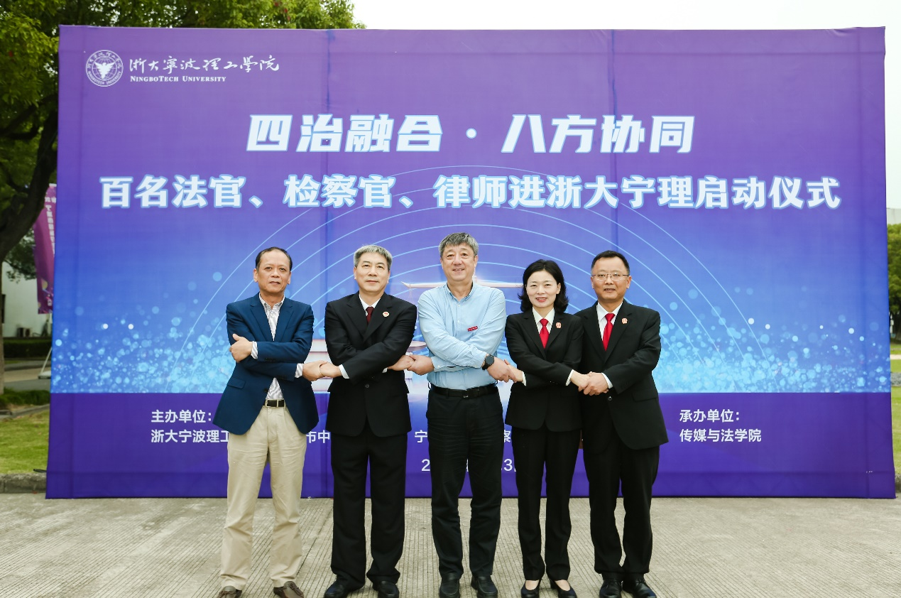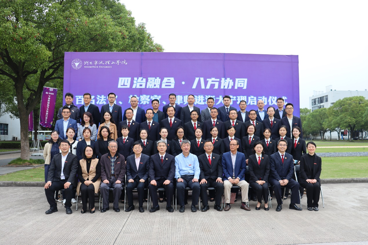 为深入学习贯彻党的二十大精神和习近平总书记关于加强法治人才培养的重要指示精神,11月3日,我校联合宁波市中级人民法院、宁波市人民检察院、宁波市司法局共同举行“百名法官、检察官、律师进校园活动”启动仪式。浙大宁波理工学院党委书记胡征宇、宁波市中级人民法院政治部主任石坚强、宁波市人民检察院副检察长吕海庆、宁波市司法局副局长忻思忠出席启动仪式。学校学工部、教务处、传媒与法学院相关领导以及来自宁波各地的法官、检察官、律师代表和传媒与法学院法律系教师、2020级法学专业全体学生共同出席仪式。仪式由浙大宁波理工学院启新特聘教授金彭年主持。