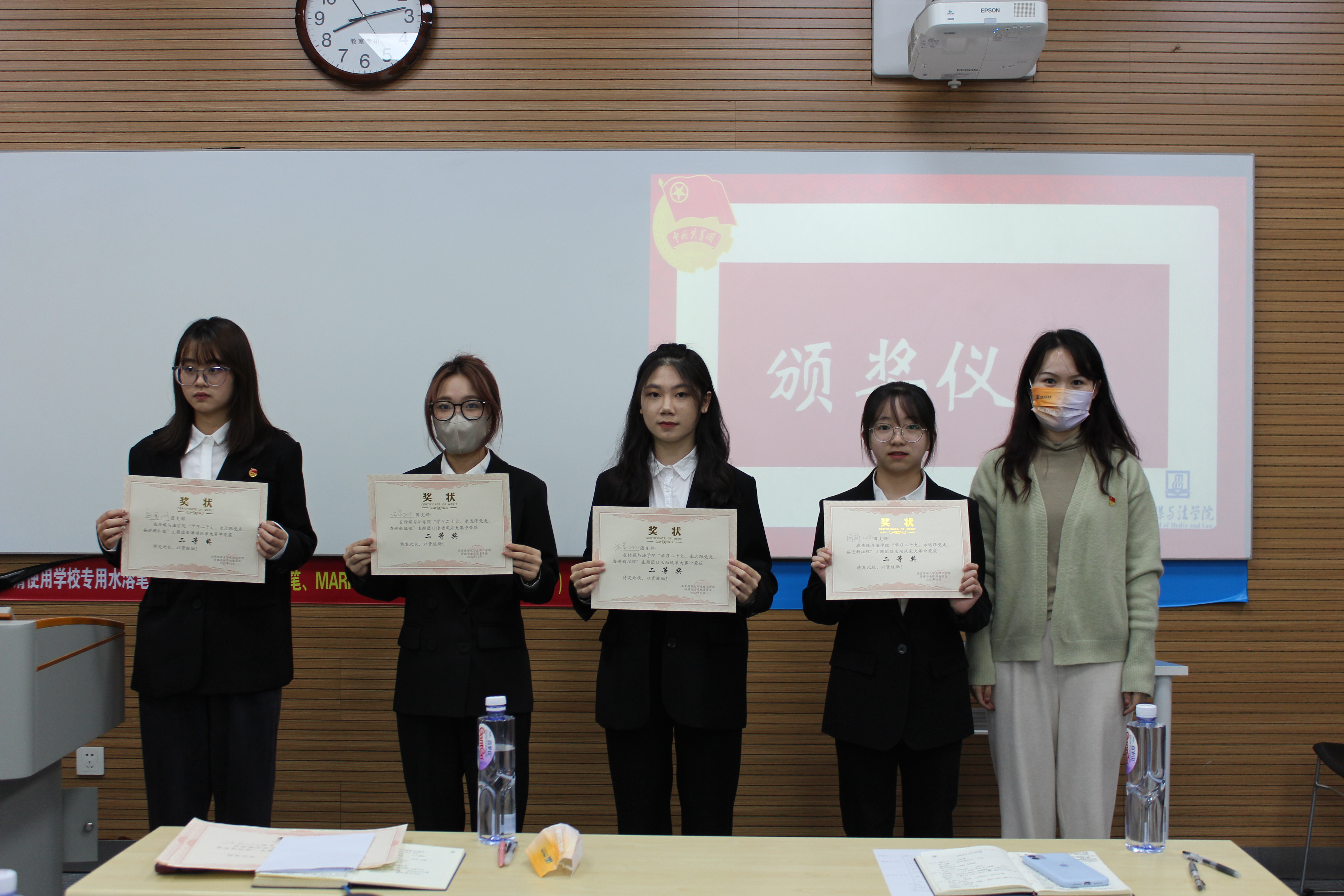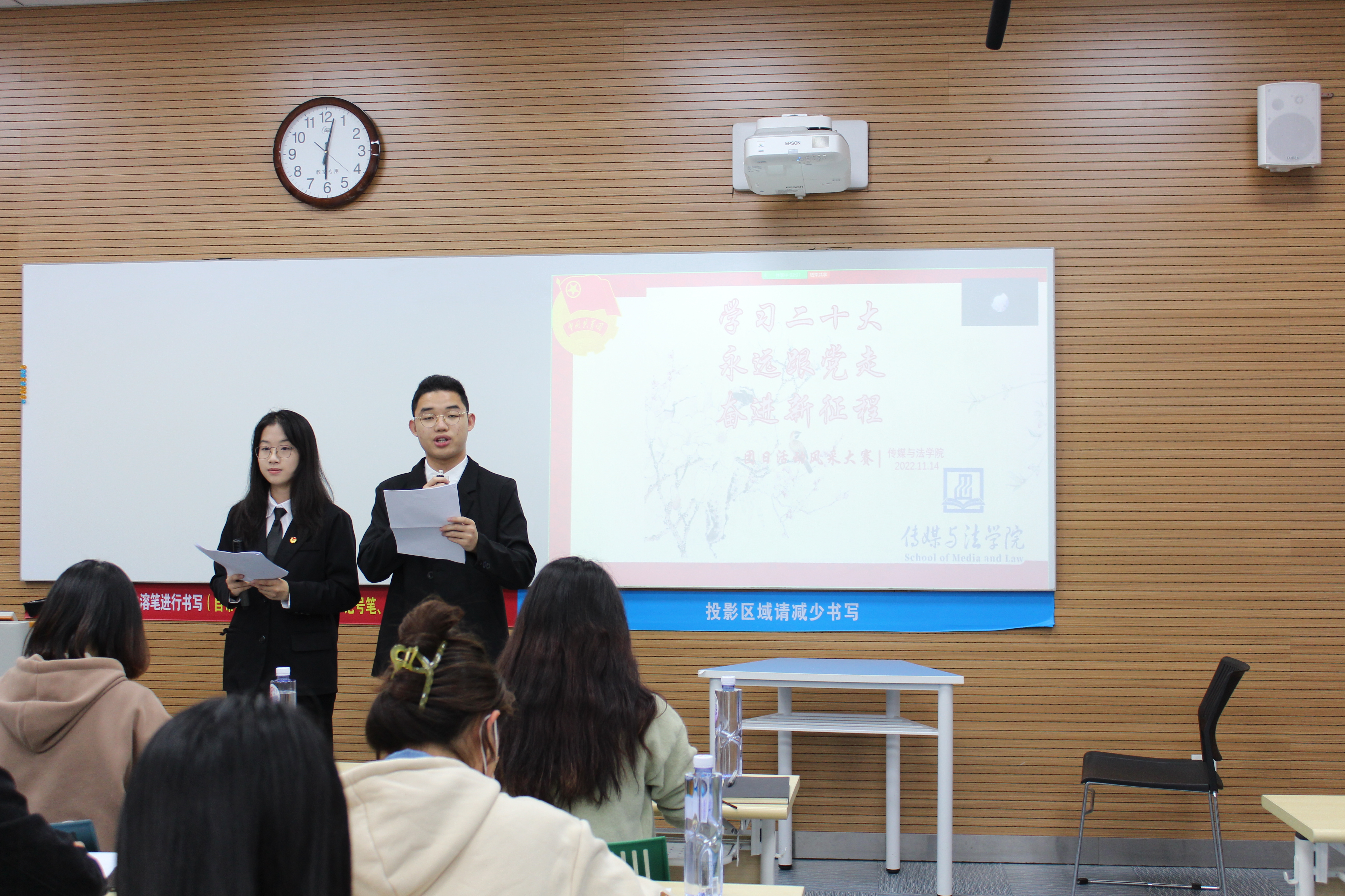 为深入学习贯彻党的二十大精神,集中体现学院团员青年风貌,展现各班级的团日活动特色。11月14日晚,传媒与法学院于NB108开展“学习党的二十大、永远跟党走、奋进新征程”主题团日活动风采大赛。学院团委书记李倩倩,团委副书记鲁晓玲,辅导员杨潮,团委主席团代表担任本次比赛评委。