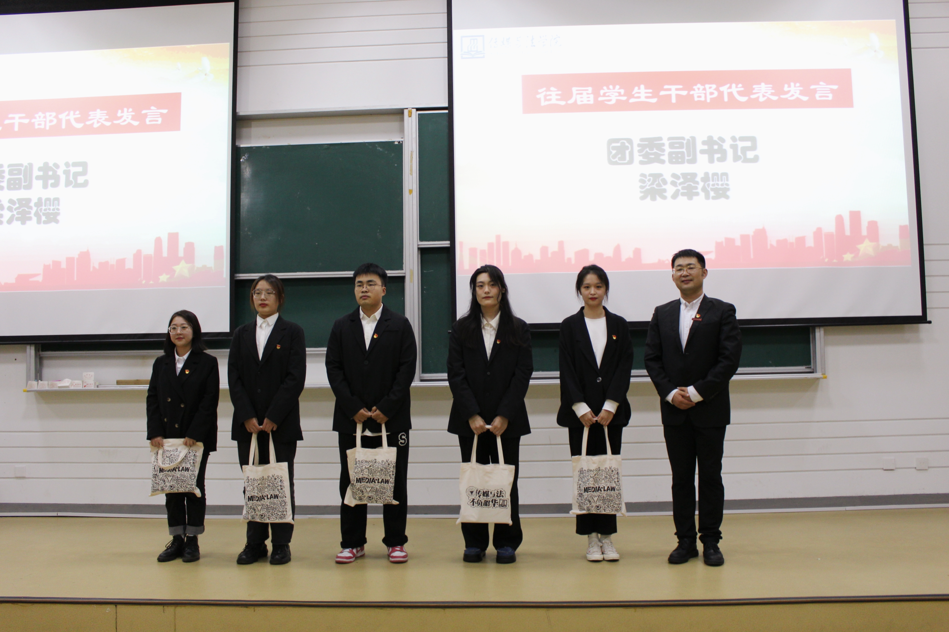 紧接着,前任团委副书记(学生)梁泽樱作为往届学生干部代表发言,她分享了自己的工作经历并传授了一些工作经验,以激励同学们不断努力,珍惜学生干部工作机会。现任学生干部代表、学生会执行主席叶涵作为代表发言,她表示新一届团学干部在继承发扬传法学院的优良传统的同时,要充分发扬奉献、友爱、互助、进步的精神,搭建新的舞台、开创新的局面,努力使我院团学工作提升到一个新的水平。现任学生干部代表,红色青年党教中心主任张程钰榕分享了自己在大学学生干部生涯中的收获,希望学生干部们能够把自己的成长发展与党的成长发展结合起来。