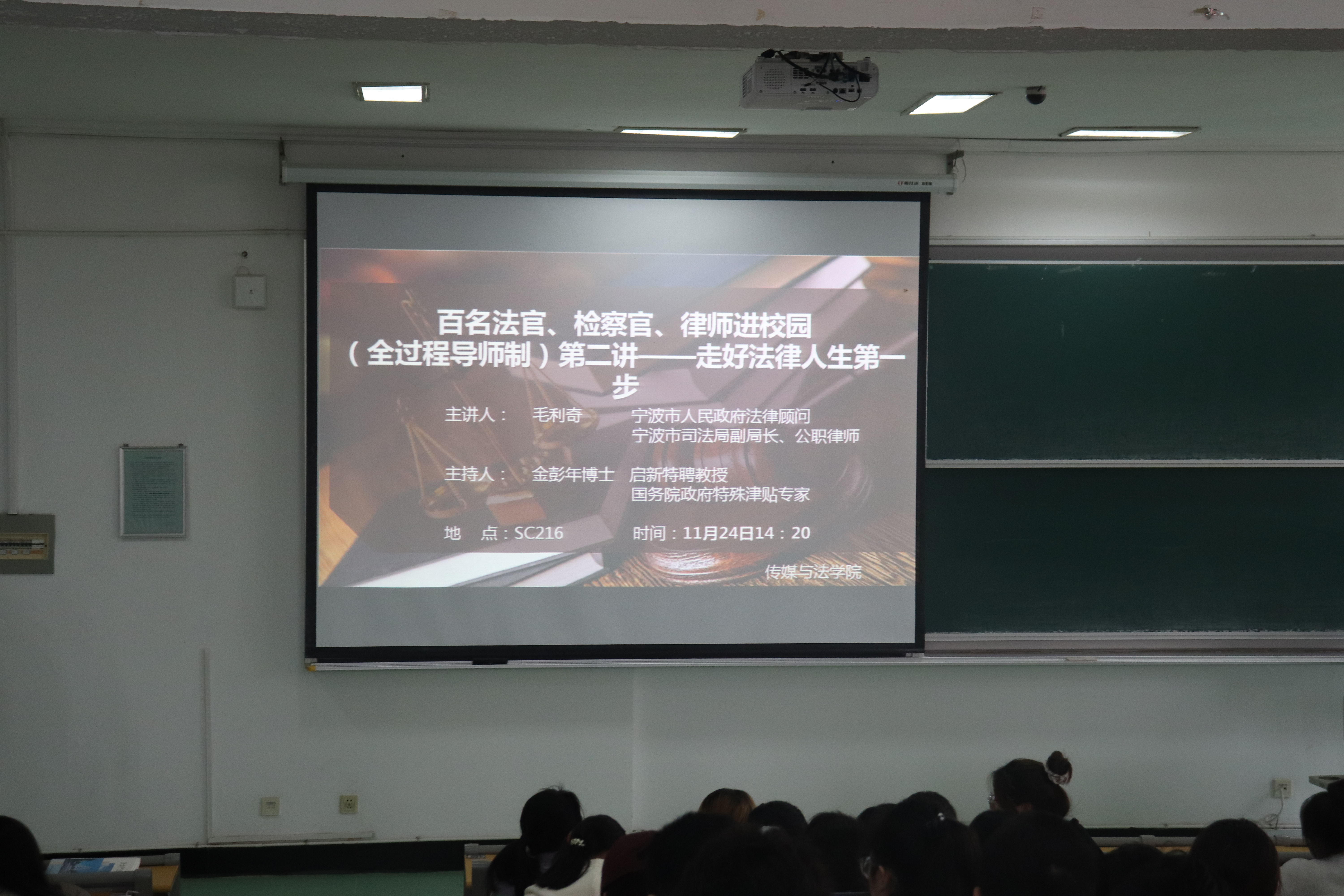 11月24日下午,百名法官、检察官、律师进校园(全过程导师制)第二讲“走好法律人生第一步”活动在SC216顺利进行,本次活动由启新特聘教授、国务院政府特殊津贴专家金彭年主持,宁波市司法局副局长毛利奇主讲,传媒与法学院法学专业2022级全体学生参加本次活动。