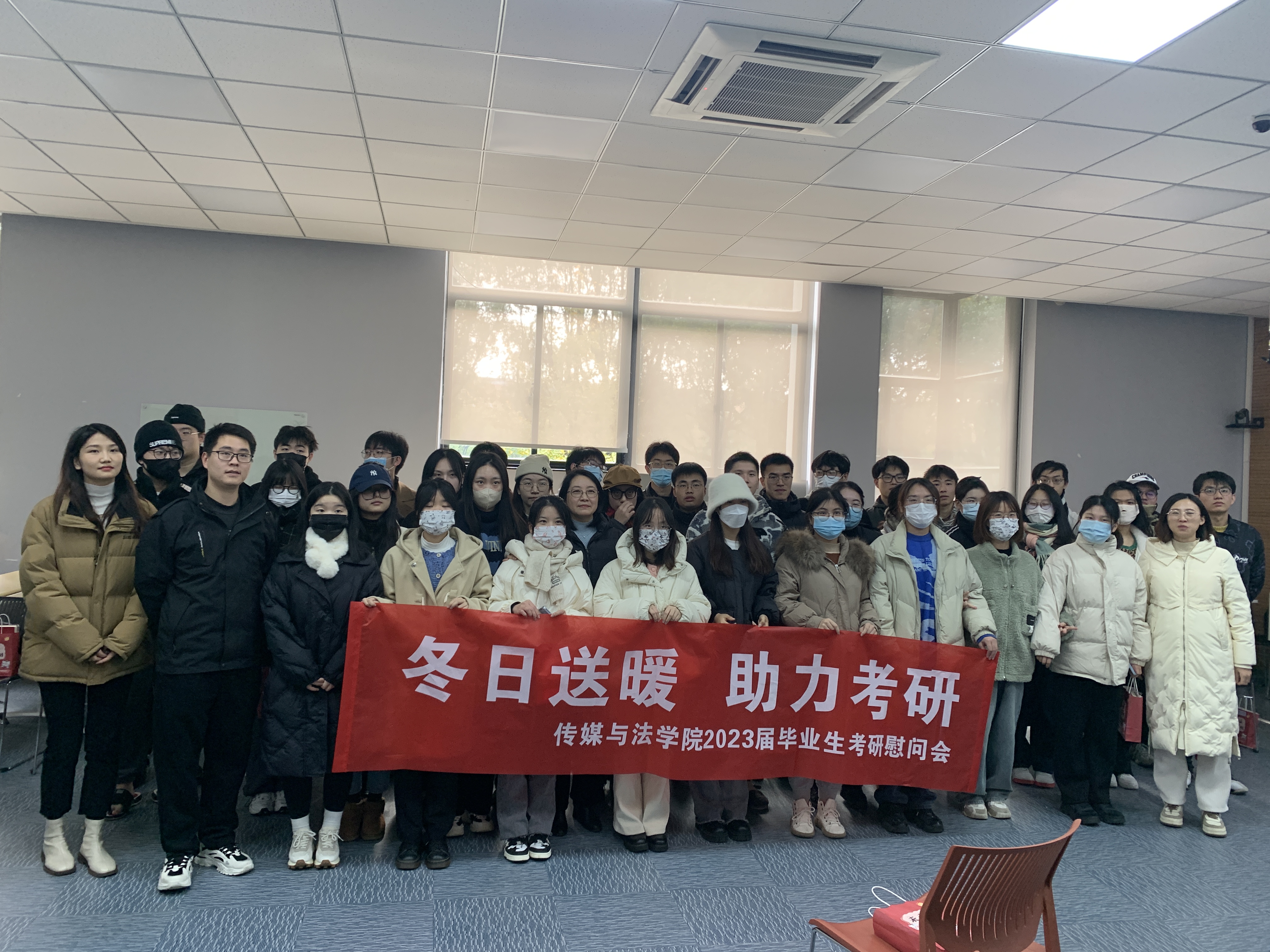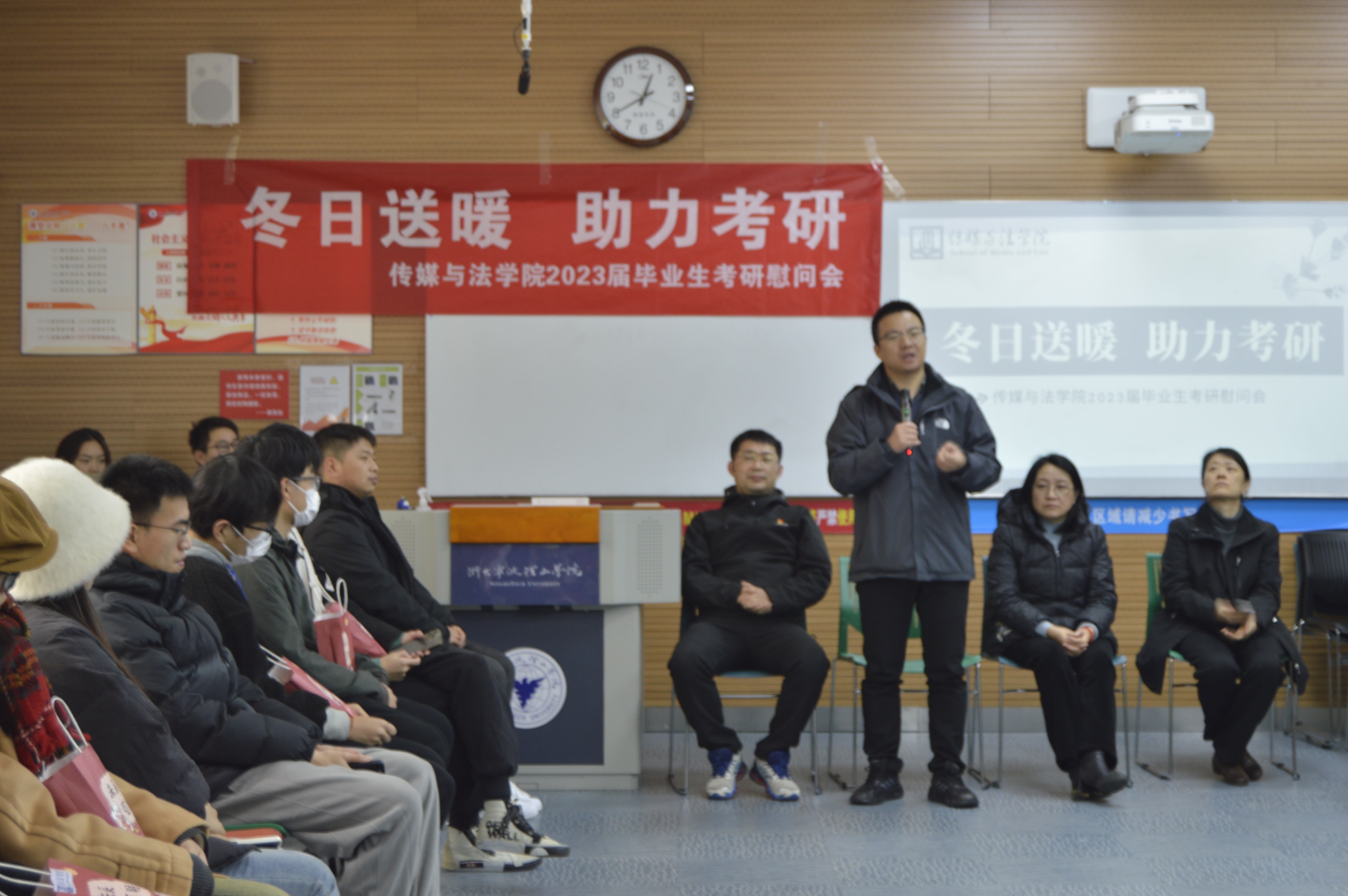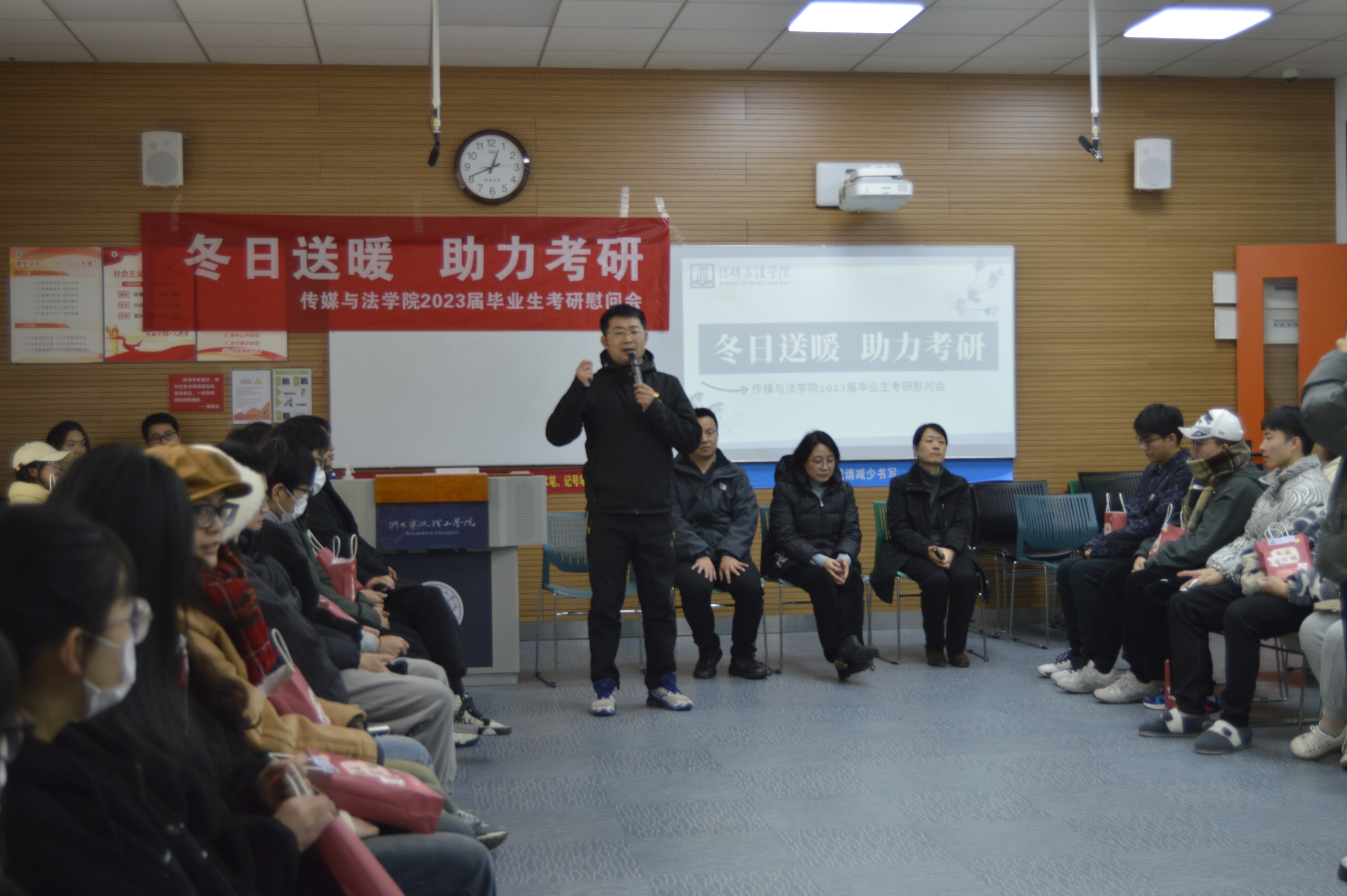 12月2日,“冬日送暖,助力考研”传媒与法学院2023届毕业生考研慰问会在NB110进行。传媒与法学院党委书记朱小红,副院长韩缨,党委副书记、纪委书记胡鹿鸣,副院长李志,学工办全体辅导员和学院2023届考研学子参与了本次慰问会。活动由学院思政副主管奚捷捷主持。