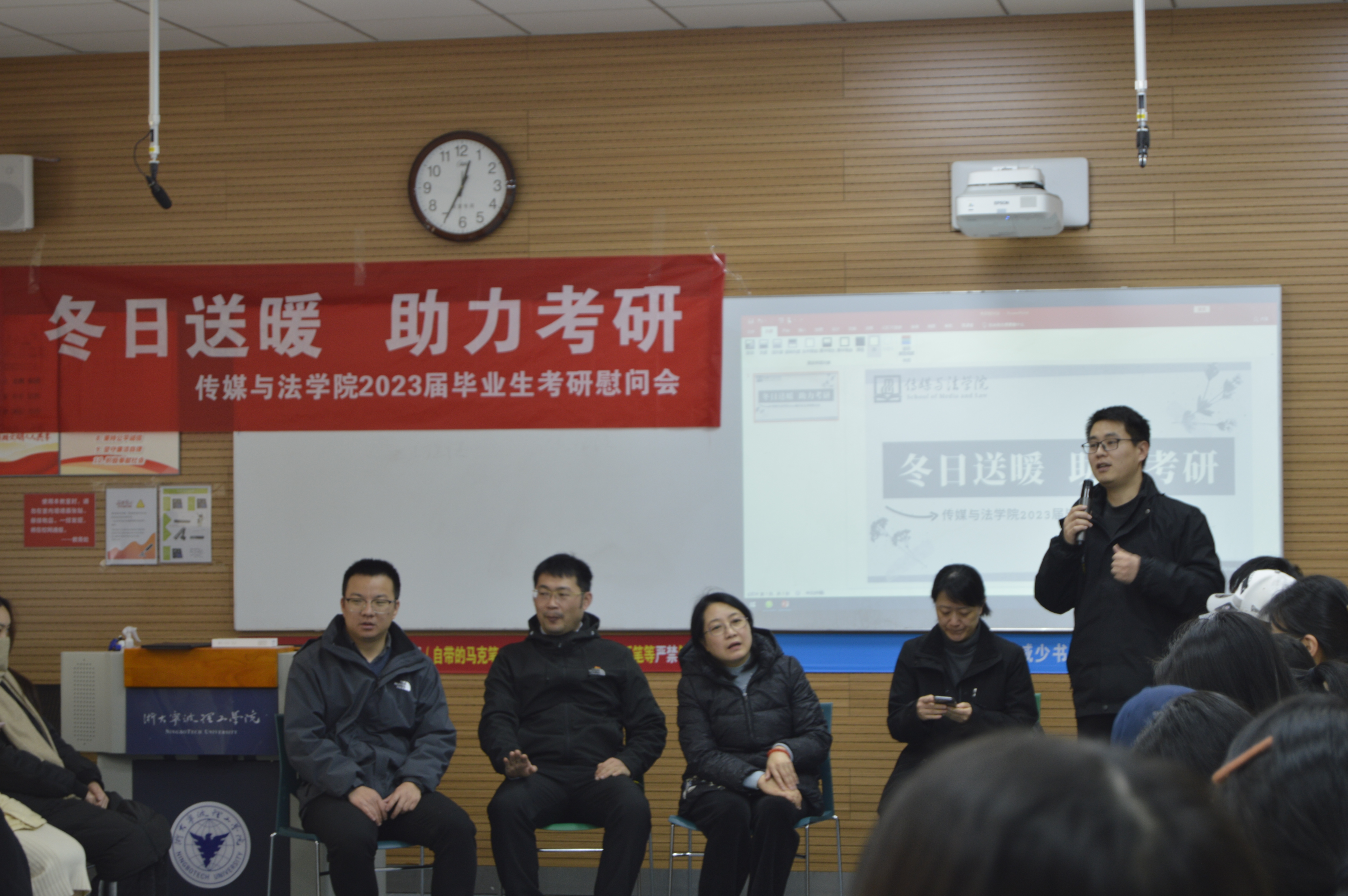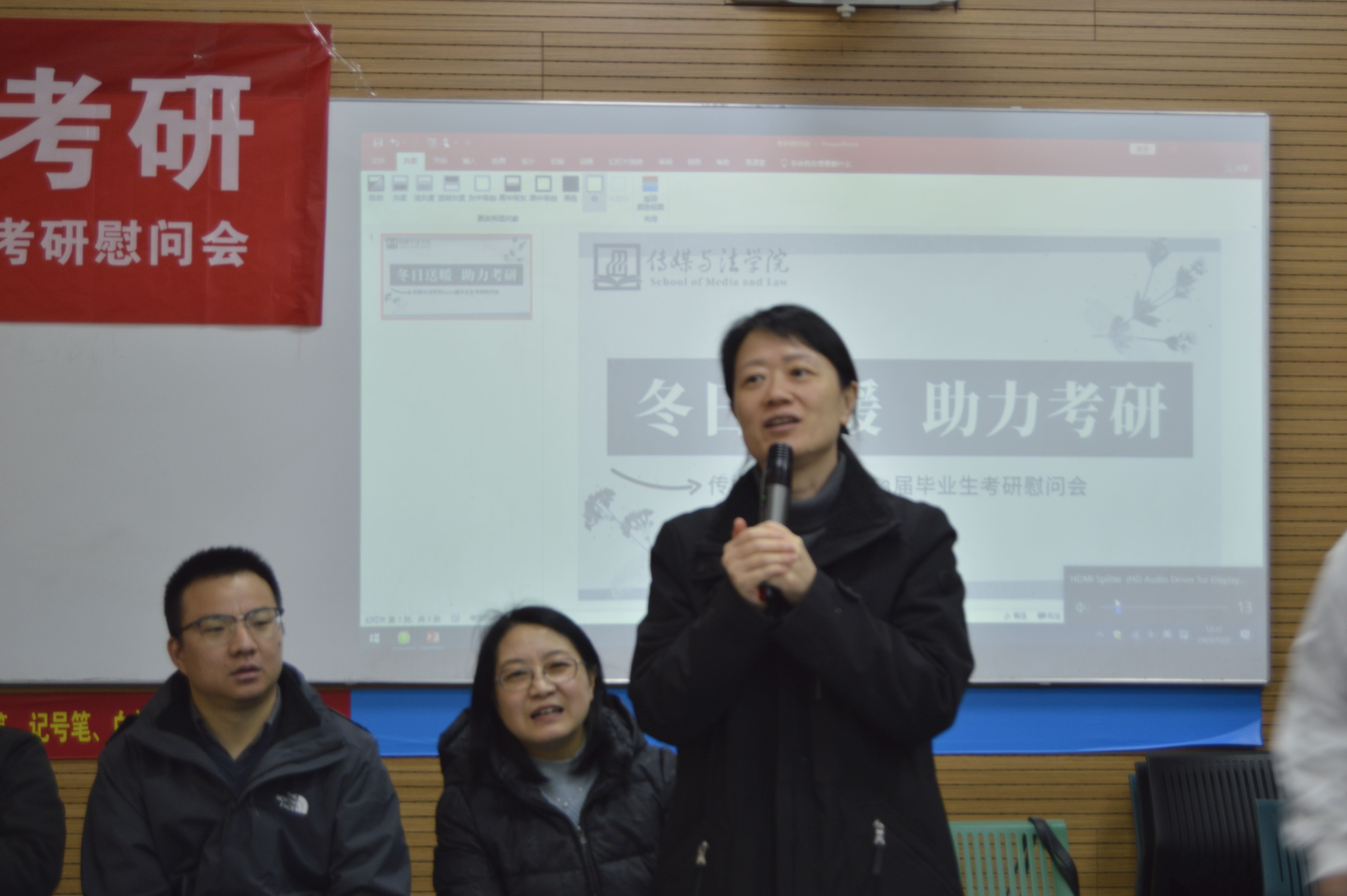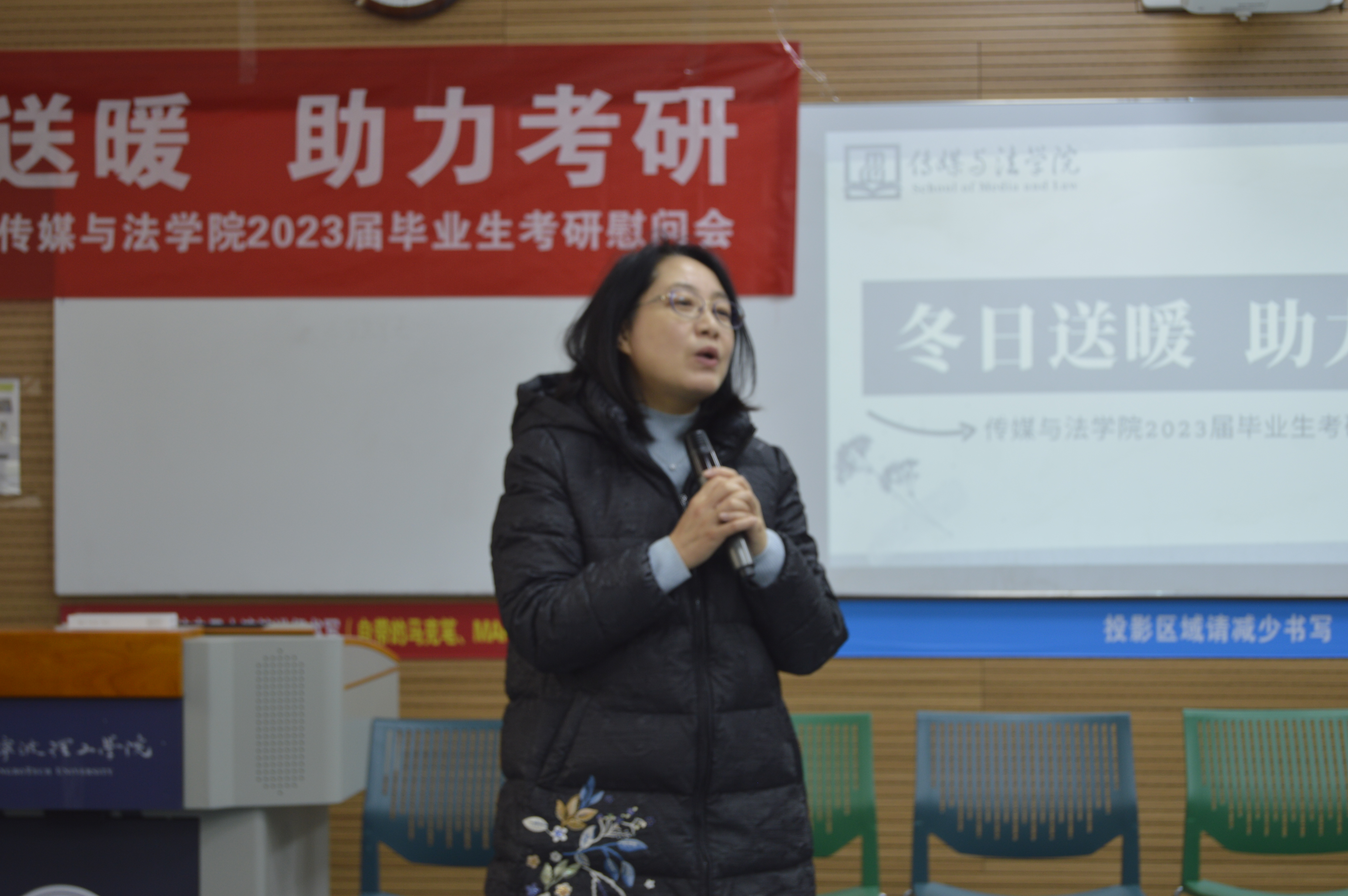 12月2日,“冬日送暖,助力考研”传媒与法学院2023届毕业生考研慰问会在NB110进行。传媒与法学院党委书记朱小红,副院长韩缨,党委副书记、纪委书记胡鹿鸣,副院长李志,学工办全体辅导员和学院2023届考研学子参与了本次慰问会。活动由学院思政副主管奚捷捷主持。