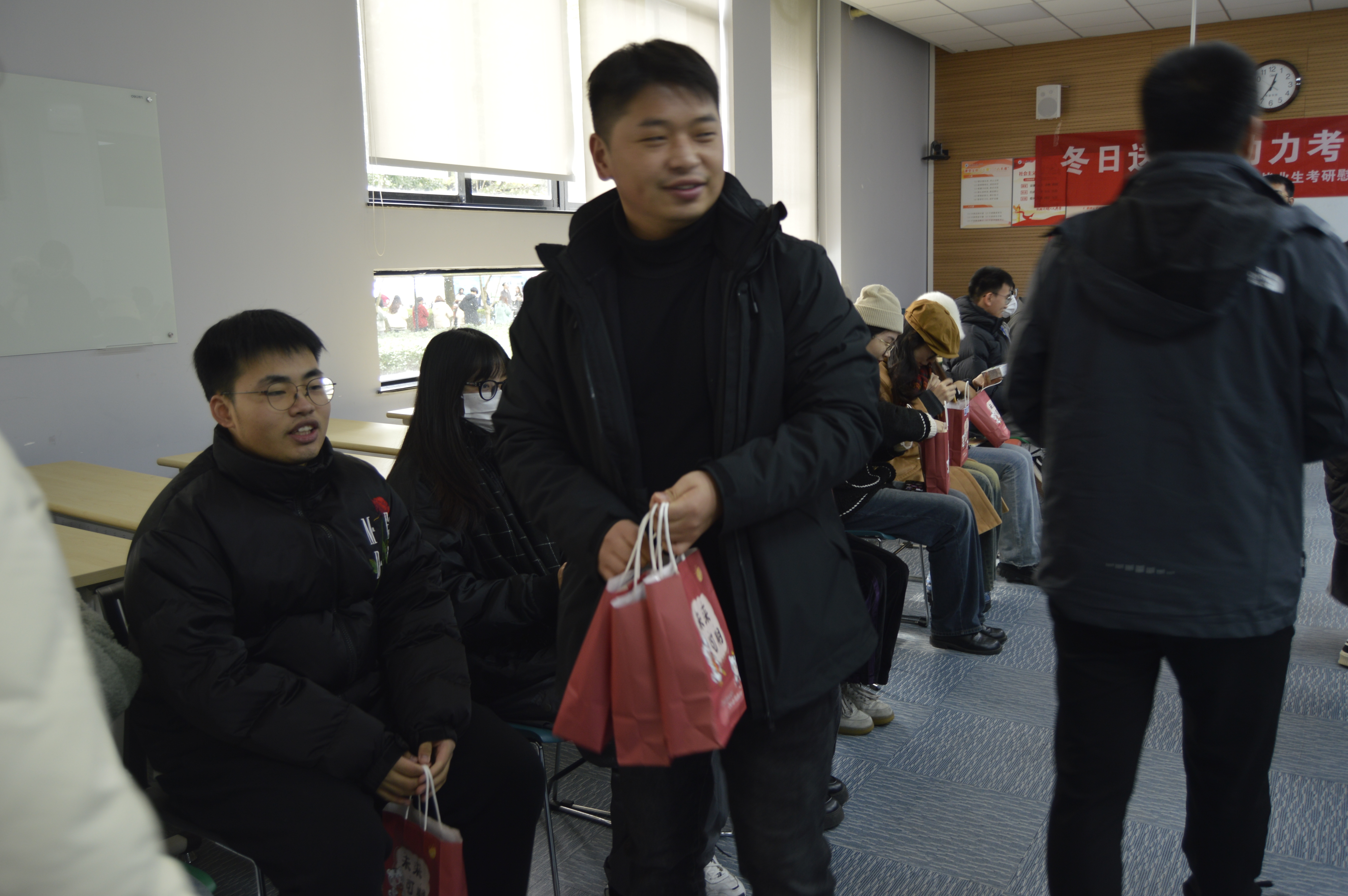 寒风凛冽,却挡不住老师们对考研同学们的热情关怀。慰问会上,老师们给考研同学发放了慰问礼物,寄托了老师们对考研同学的真切祝福。韩缨鼓励同学们在接下来的二十多天里继续努力,调整好自己的状态。胡鹿鸣希望同学们能够适当地放松下来,把自己的心理状态和身体状态调整到最好,注意饮食、保暖、睡眠等方面的问题,以最佳状态迎接考试。李志强调考研学子们要充满信心。