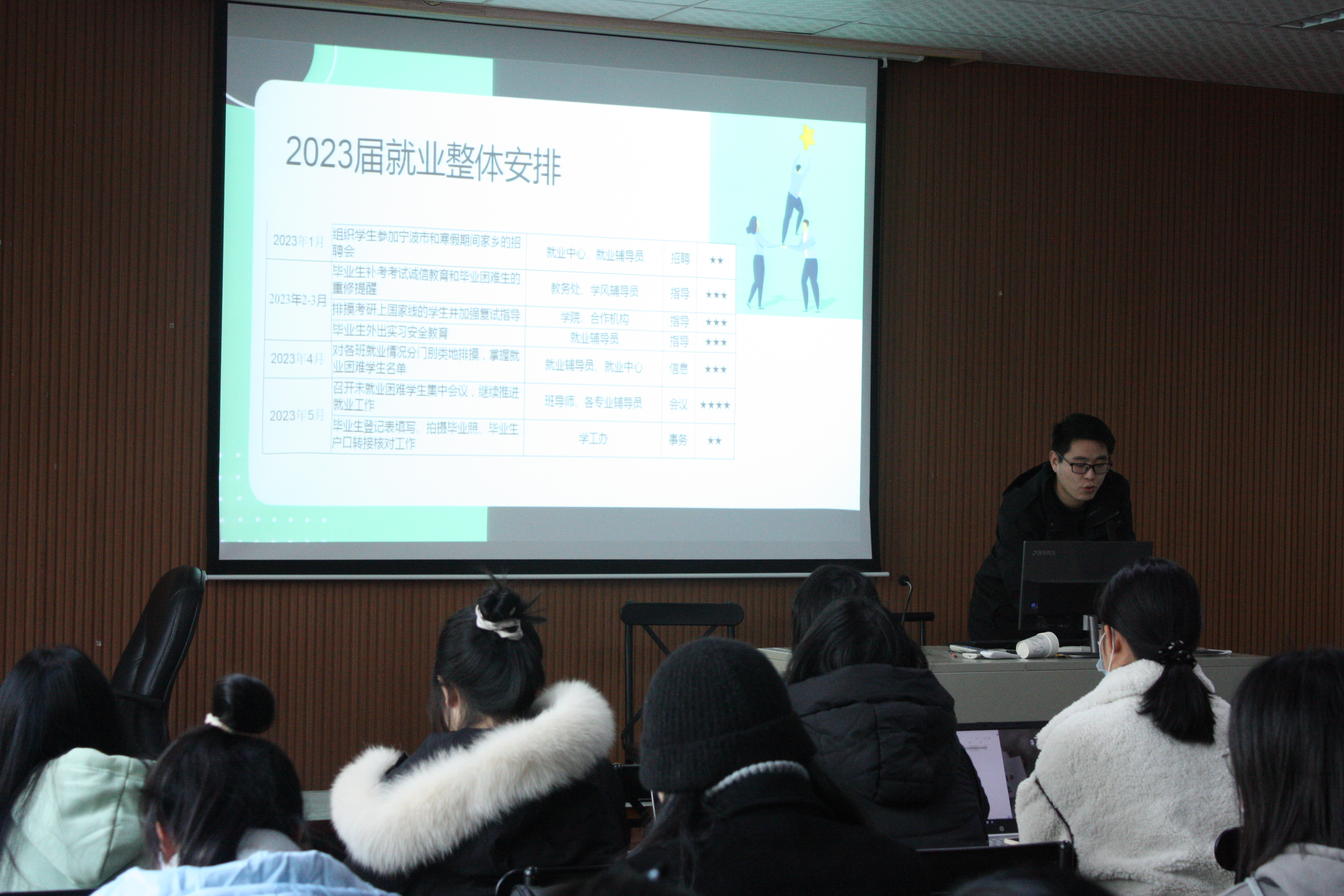 奚捷捷根据2023届就业形势,结合去年就业情况,给同学们介绍了就业相关的具体资讯,包括就业协议网签申请流程、宁波市就业政策、学院就业月安排等,使同学们的就业规划更加全面、具体。