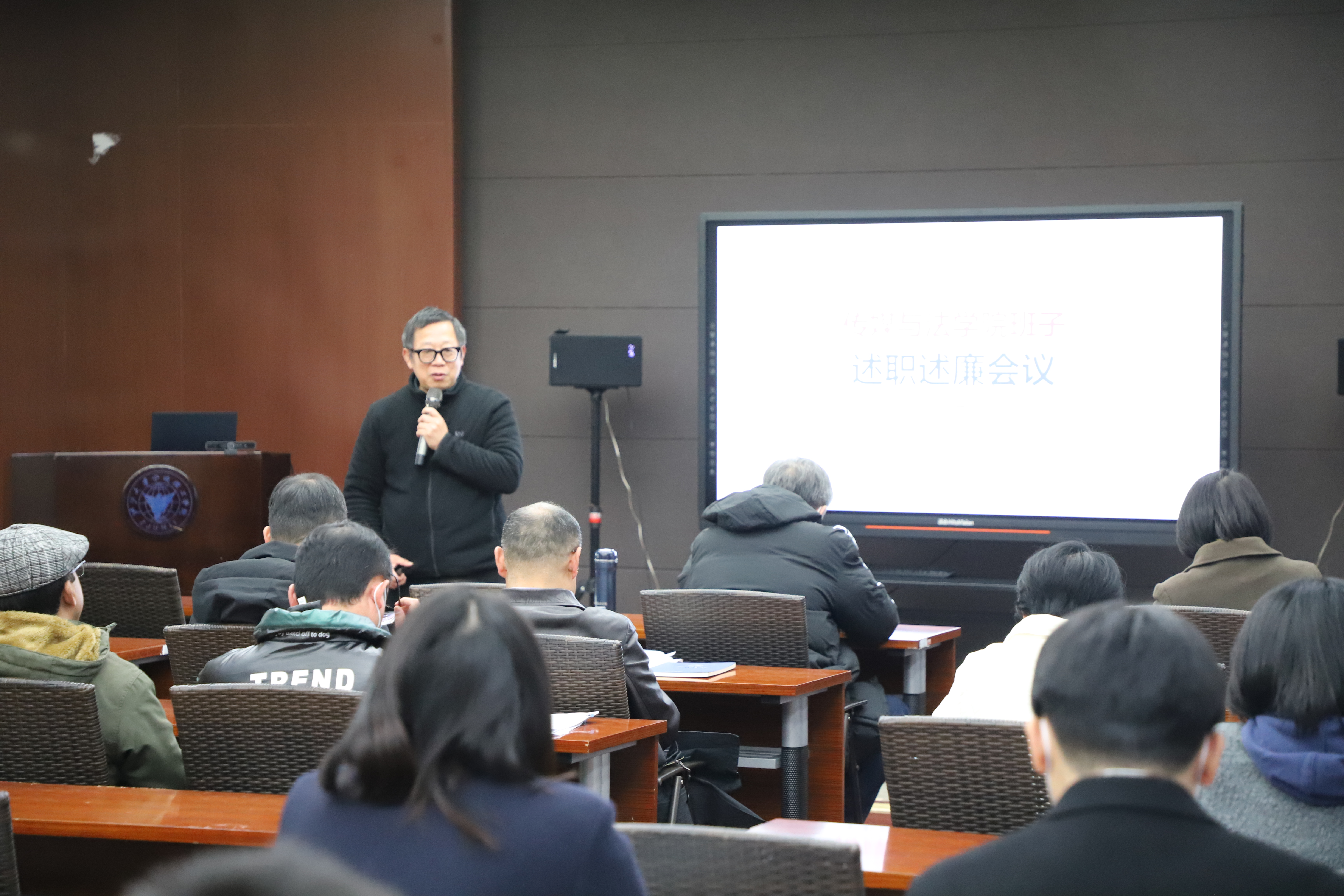 吴飞院长代表班子进行了2022年度的班子述职述廉。他向全院报告了班子2022年工作情况。报告涵盖班子建设运行情况与年度亮点、工作实绩与标志成果、学院经费使用情况、不足之处与明年要点等四个部分。吴院长指出过去的一年学院取得了新闻与传播专硕学位点通过校内评审、浙江省教学成果一等奖、省部级以上项目与核心论文双破新高、法考通过率创历史新高、引进10名高层次人才、重大产学研平台取得突破性进展等重要荣誉,这些成绩的取得离不开全体师生的努力与付出,对此他表示了充分的肯定和感谢,并再次给全体教职工鼓劲,力争明年申硕成功。接着学院班子成员吴飞、朱小红、韩缨、胡鹿鸣、李志分别就个人一年开展的工作情况进行了述职述廉。