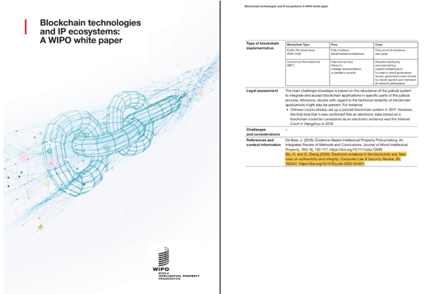 传媒与法学院吴泓老师发表的SSCI论文(‘Electronic Evidence in the Blockchain Era: New Rules on Authenticity and Integrity’, Computer Law & Security Review , Volume 36, April 2020,SSCI 1区)被联合国下属专门机构“世界知识产权组织(WIPO)”2022年发布的《区块链技术和知识产权生态系统白皮书》(Blockchain Technologies and IP Ecosystems: A WIPO White Paper)成功引用。