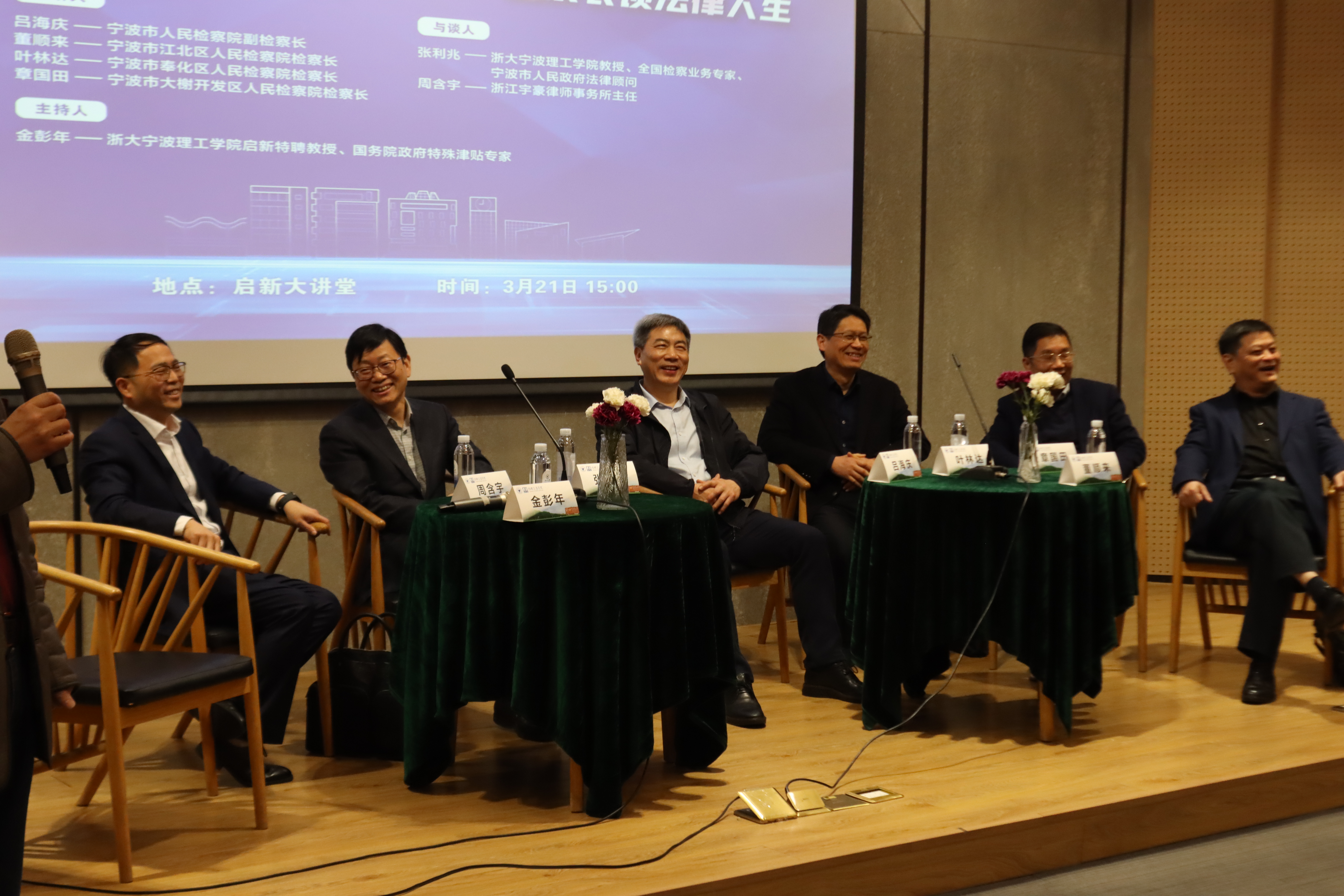 3月21日,传媒与法学院举办“全过程导师制——百名法官、检察官、律师进校园”活动第三讲——“检察长谈法律人生”。本次活动有幸邀请到了宁波市人民检察院副检察长吕海庆、宁波市江北区人民检察院检察长董顺来、宁波市奉化区人民检察院检察长叶林达、宁波市大榭开发区人民检察院检察长章国田共4位检察长前来讲学。本次活动由我校启新特聘教授金彭年主持,法律系教授张利兆、浙江宇豪律师事务所主任周含宇担任与谈人,宁波市人民检察院法律政策研究室主任陈鹿林担任嘉宾。