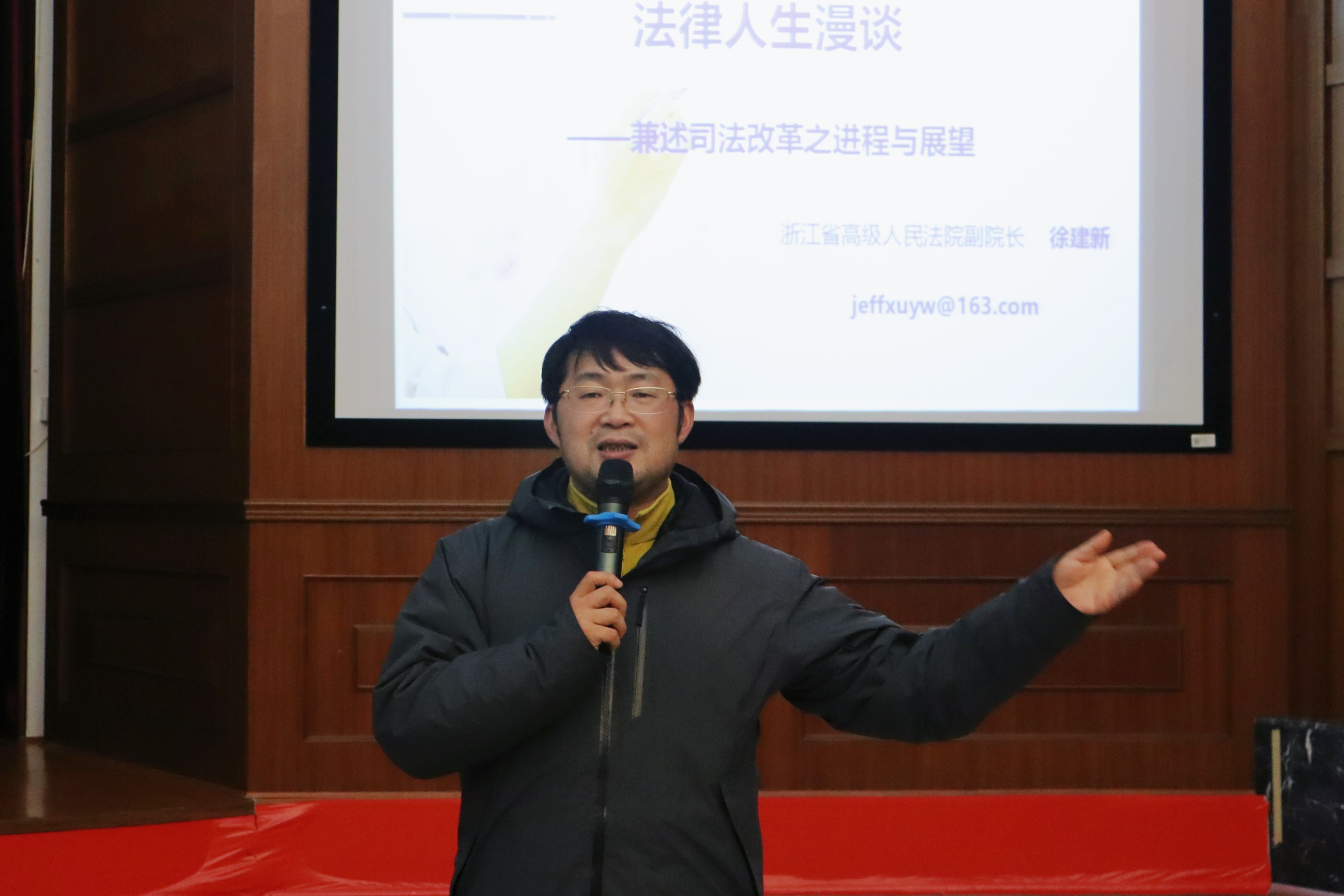 活动中,徐建新院长结合了自己的个人经历慷慨无私地与同学们分享了学习、生活和工作上的建议。在讲到自己在司法工作中的苦与乐时,他提到“法治中国梦很大,需要一代又一代法官不懈的追求;法治中国梦也很小,就在我们对每一个案子的公正裁判中”。随后,徐建新院长结合自己的工作经历形象生动地介绍了司法改革进程,加深了同学们对司法改革举措的理解。
