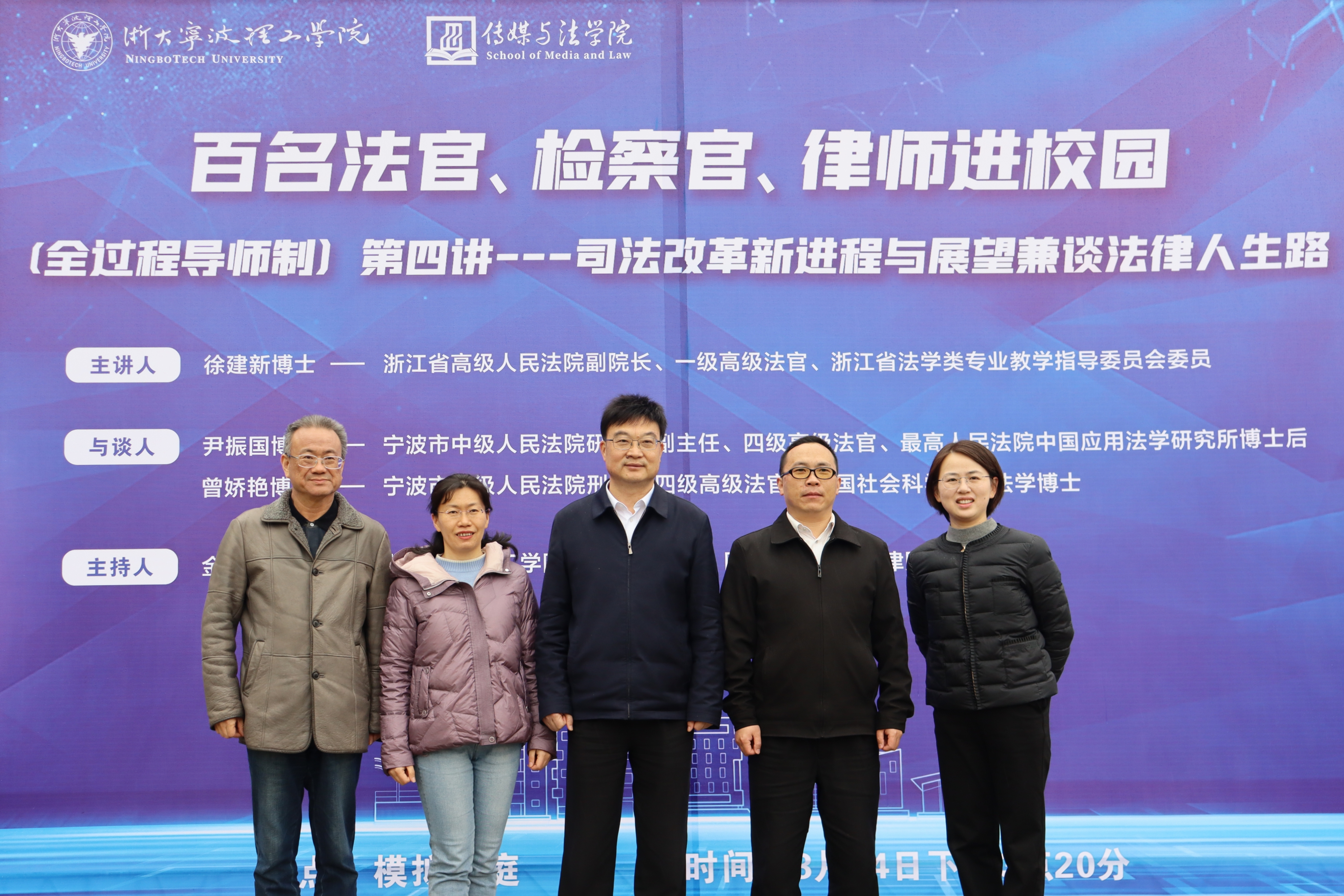 3月24日,为帮助传媒与法学院法学学子了解司法改革新进程,进一步走好法律人生路,百名法官、检察官、律师进校园(全过程导师制)第四讲——“司法改革新进程兼谈法律人生路”活动在模拟法庭顺利举行。本次活动由启新特聘教授、国务院政府特殊津贴专家金彭年主持,浙江省高级人民法院副院长、一级高级法官、全国审判业务专家、浙江省法学类专业教学指导委员会委员徐建新主讲,同时邀请到宁波市中级人民法院研究室副主任、四级高级法官、最高人民法院中国应用法学研究所博士后尹振国和宁波市中级人民法院刑三庭四级高级法官、中国社会科学院刑法学博士曾娇艳作为与谈人,传媒与法学院教师刘敏和陈丹琪也参加了此次活动。