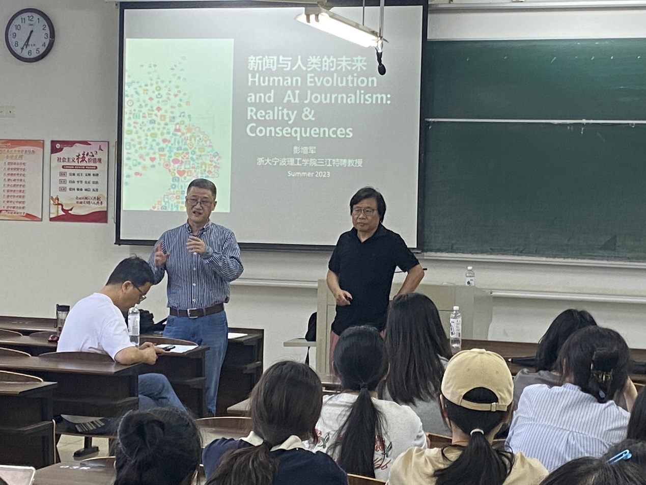 为提升新闻专业学生的基本知识和技能,开拓国际视野,了解新闻行业的发展趋势和方向,6月8日晚,我院特邀学校“三江学者”特聘教授彭增军为新闻学子在NB322做了一场“新闻与人类的未来”为主题的讲座,学院院长助理李义杰主持该讲座,何镇飚教授等老师一同参加。