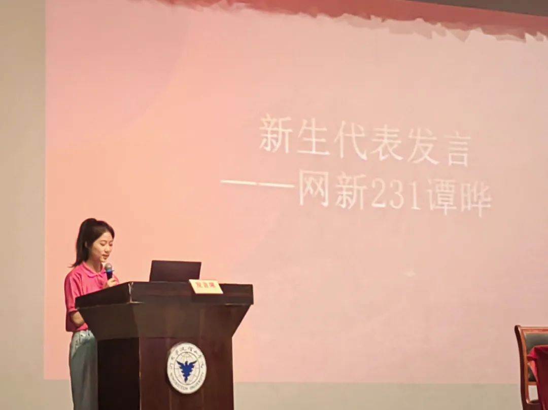 网新231班谭晔作为新生代表发言,她表示,选择宁理是为自己的人生画卷渲染底色,而成为一名网新人是为这幅画卷定下的主题。她呼吁大家努力践行“明德弘毅,开物启新”的校训,传承“求真”之精神,探索极新之事物,绘制精彩的人生画卷。
