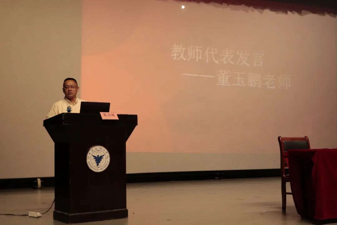 法律系常务副主任董玉鹏老师作为学院教师代表发言,他从三个要点为新生大学的学习提供建议。第一,热爱法律,树立法律信仰。第二,学会独立思考,善于钻研。第三,法学的学习需要精益求精的学习态度。希望新生怀揣梦想,脚踏实地,在追求真理的过程中成就有意义的人生。