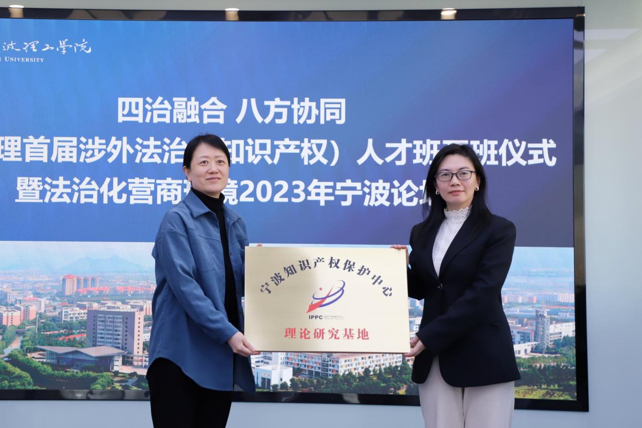 随后举行授牌仪式。传媒与法学院与宁波知识产权保护中心相互授牌,共建“浙大宁波理工学院涉外法治人才培养协同创新基地”和“宁波知识产权保护中心理论研究基地”。