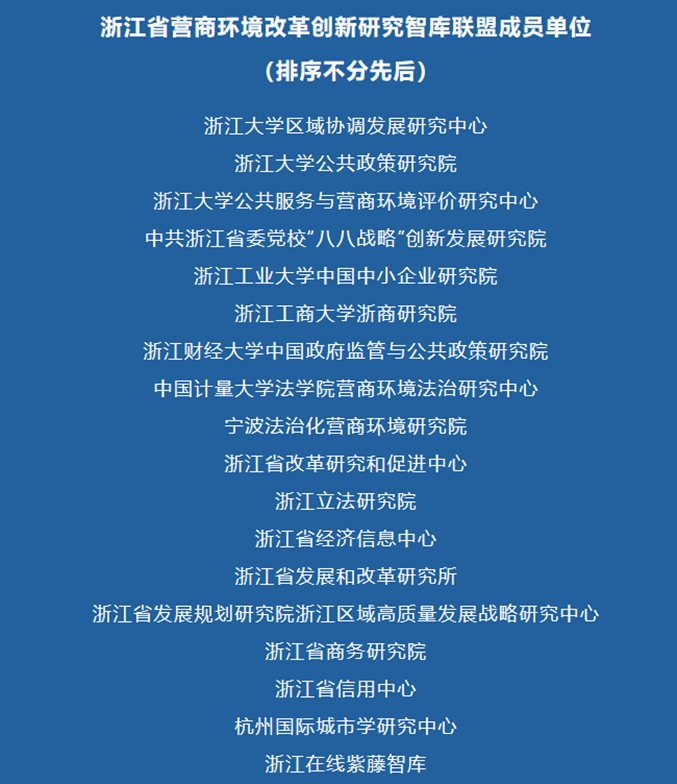 浙江省营商环境改革创新研究智库联盟由省社科院发展战略和公共政策研究院牵头成立,旨在加强全省智库资源整合,协同为浙江全面打造一流营商环境升级版、全力打造营商环境最优省、在中国式现代化新征程上再创发展环境新优势提供理论支撑与智力支持。联盟成员单位由18家省新型重点专业智库、高校智库、媒体智库以及其他智库型研究机构组成。