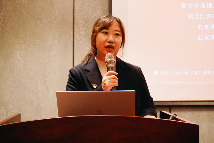 传媒与法学院法律系主任韩小梅就党建共建主题发表讲话。韩老师表示浙大宁波理工学院自建校以来就尤其重视立足宁波开展多维度的校地合作,在融合与开放中形成人才培养和发展的共同体。法学作为学校最早设立的几个专业之一,致力于践行协同育人理念,创建了多个共建交流平台,其中由金彭年教授创建的“百名法官、检察官、律师进校园(全过程导师制)”实践活动已成为了宁波市校地合作的品牌项目,此次活动也是该品牌项目的深入延续和发展。韩老师还表示希望通过本次活动学校和律所间建立更紧密、更长效的合作交流机制,同时欢迎律所能将浙大宁理作为实践活动基地,律师们能够走进校园开展教学交流活动。