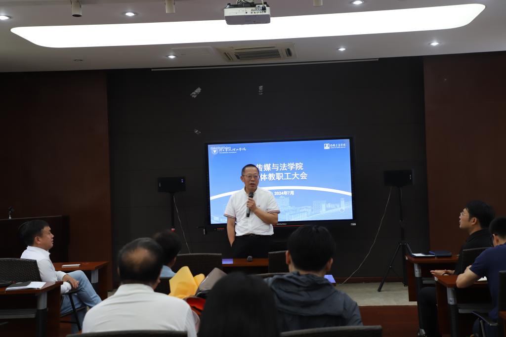 2024年7月1日中午传媒与法学院在SC101会议室召开学期末全体教职工大会。本次会议由学院党委副书记、纪委书记胡鹿鸣主持,学院全体教职工参加。