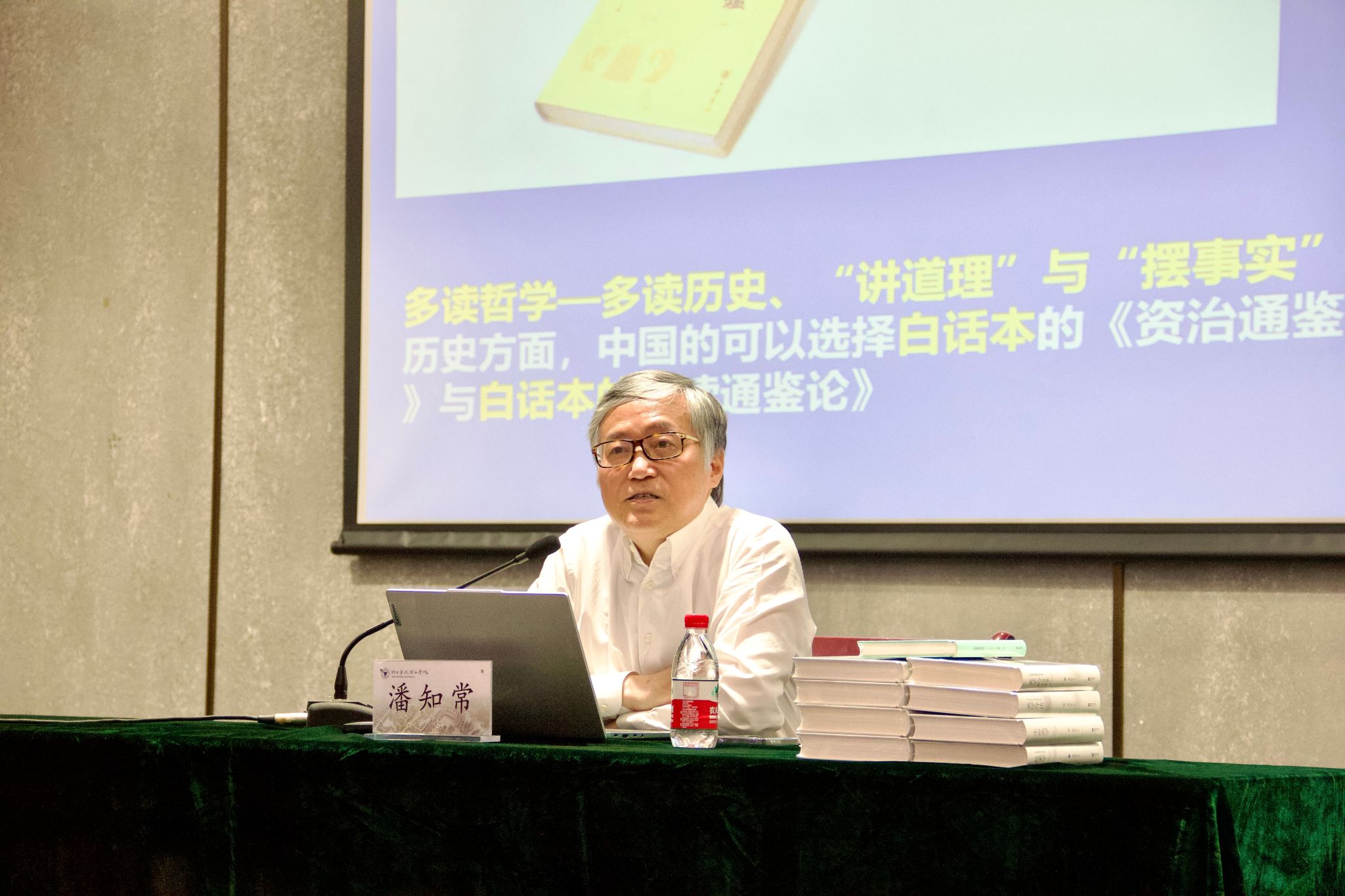 活动伊始,杨国富代表学校为潘知常教授送上了纪念品,同时,潘知常教授带来了自己参与撰写的一整套书籍赠送给学校。