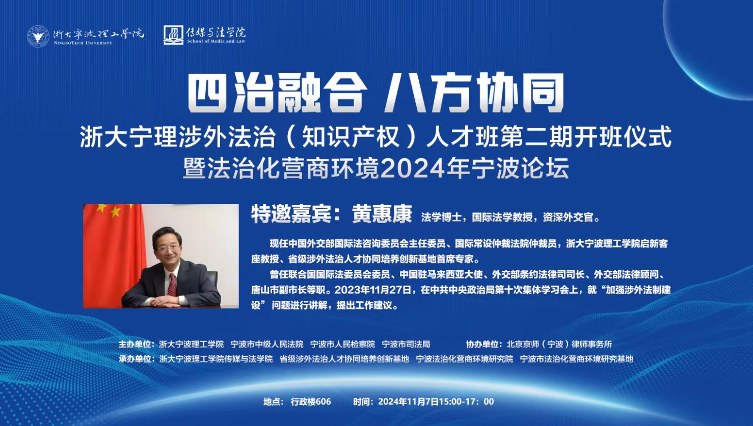 2024年11月7日,法治化营商环境2024年宁波论坛在浙大宁波理工学院召开。浙大宁波理工学院副校长张荣祥致欢迎词,浙江省人大常委会法制委员会、宁波市中级人民法院、宁波市人民检察院、宁波市司法局、宁波市市场监管局、宁波国际商事法庭、浙江波宁律师事务所、北京京师(宁波)律师事务所、泰国汉成律师事务所、大成(杭州)律师事务所等单位负责同志参加会议。会议特别邀请外交部国际法咨询委员会主任、武汉大学特聘教授黄惠康作“加强涉外法制建设的时代逻辑和根本遵循”的主题讲座。会议由浙江省法学会国际法研究会会长、宁波法治化营商环境研究院常务副院长金彭年主持,宁波法治化营商环境研究院院长、宁波市法治化营商环境研究基地主任张利兆,传媒与法学院党委副书记、纪委书记胡鹿鸣,传媒与法学院副院长韩缨,传媒与法学院法律系主任董玉鹏等教师代表参加了会议。