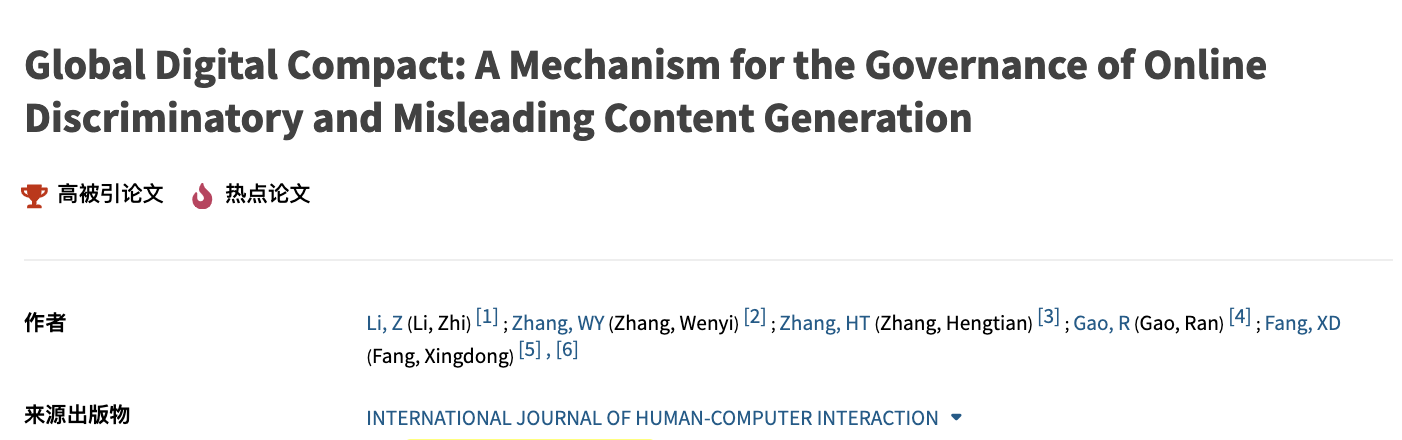 经Web of Science ESI(Essential Science Indicators)最新统计,传媒与法学院李志副教授团队研究成果,于2024年2月以李志为第一作者身份,我校为第一署名单位在International Journal of Human–Computer Interaction(SSCI 一区)期刊发表论文Global Digital Compact: A Mechanism for the Governance of Online Discriminatory and Misleading Content Generation。该论文在2024年11月入选ESI高被引论文榜(Highly Cited Papers)和热点论文(Hot Papers),被引用次数进入世界前1%,是我院学术成果的突破性进展。