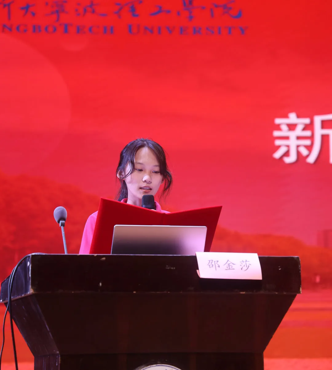 网新243班的邵金莎同学作为新生代表发言,她回顾了过去一个半月的大学生活,认为大学是逐梦的新起点,有机遇的同时也充满挑战,大家应当根据实际情况调整自己的状态。她呼吁大家铭记“明德弘毅,开物启新”的校训,并始终牢记习近平总书记对传媒人的新要求,用心去做好这个时代的记录者和传播者,讲述时代好故事、传播时代好声音,将所学运用到生活中,用手中的笔为时代放歌。