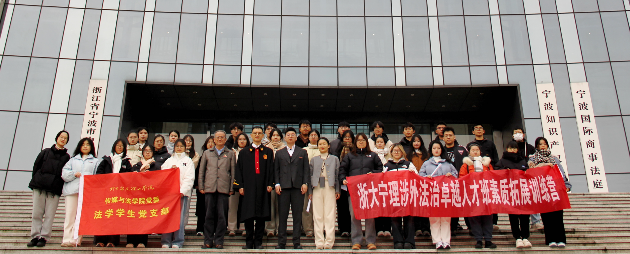 为拓宽法学学生的涉外法治视野,以案释法,以观促学,12月13日,浙大宁波理工学院启新特聘教授金彭年,传媒与法学院专业老师邢洁、范一博,辅导员童银辉老师与涉外法治人才协同培养创新基地的部分师生一同前往宁波市中级人民法院开展域外合同庭审旁听活动。在宁波市中级人民法院门前,国际商事法庭庭长马洪迎接了浙大宁理涉外法治人才创新班的师生,并与师生们合影留念。