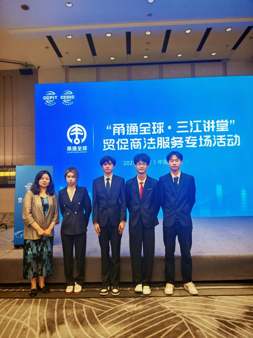 为培养涉外法治专业人才、增进我院法学学子对涉外领域法律知识的了解,2025年3月27日,传媒与法学院项安安副教授带领涉外法治卓越人才班学员泮施彤、董博、林威奇、骆长川参加了由宁波市贸促会主办的“甬通全球·三江讲堂”贸促商法服务专场活动。本次活动在宁波泛太平洋大酒店举行,旨在提升法律专业学生对涉外商事法律知识的了解和实务操作能力。