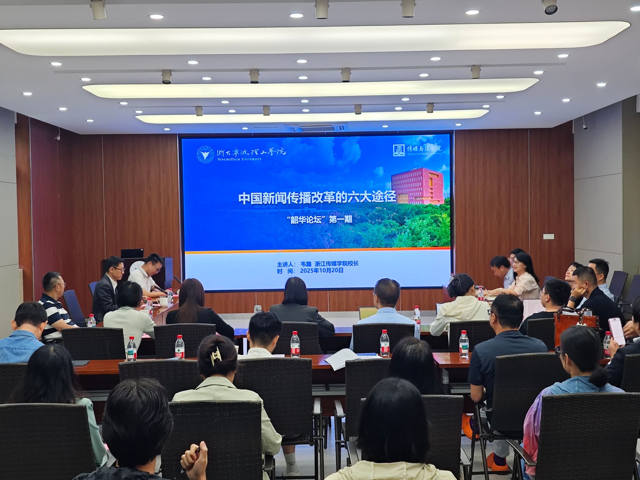 2025年10月20日,传媒与法学院“韶华论坛”首期活动顺利举办。浙江传媒学院校长韦路教授受邀担任主讲嘉宾,浙大宁波理工学院副校长章献民、职能部门负责人及学院领导班子、师生代表共同参与。活动分学科发展座谈、专题报告和课题辅导三个阶段展开。