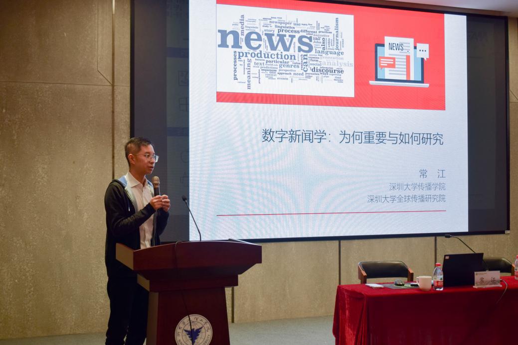 活动开始前,李志以及师生代表对常江教授的到来表示诚挚的欢迎。讲座伊始,常江教授以改革开放的氛围对他学术研究的激励为开头,谈到了何为新闻,新闻学,新闻业以及三者间的关系,回顾了新闻学的十大理论取向和经典新闻学的四个范式。随后,常江教授谈起全球新闻实践新趋势,引用多个案例说明当代新闻的数字化、平台化和情感化转向。最后,常江教授从全球脉络和中西比较两个方面介绍了数字新闻的概念体系。