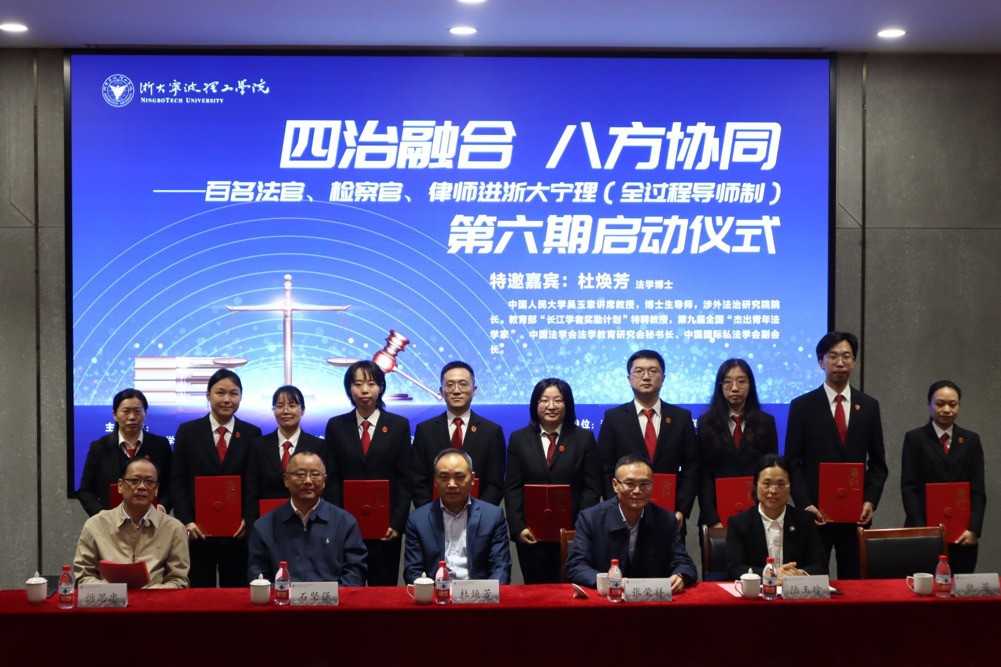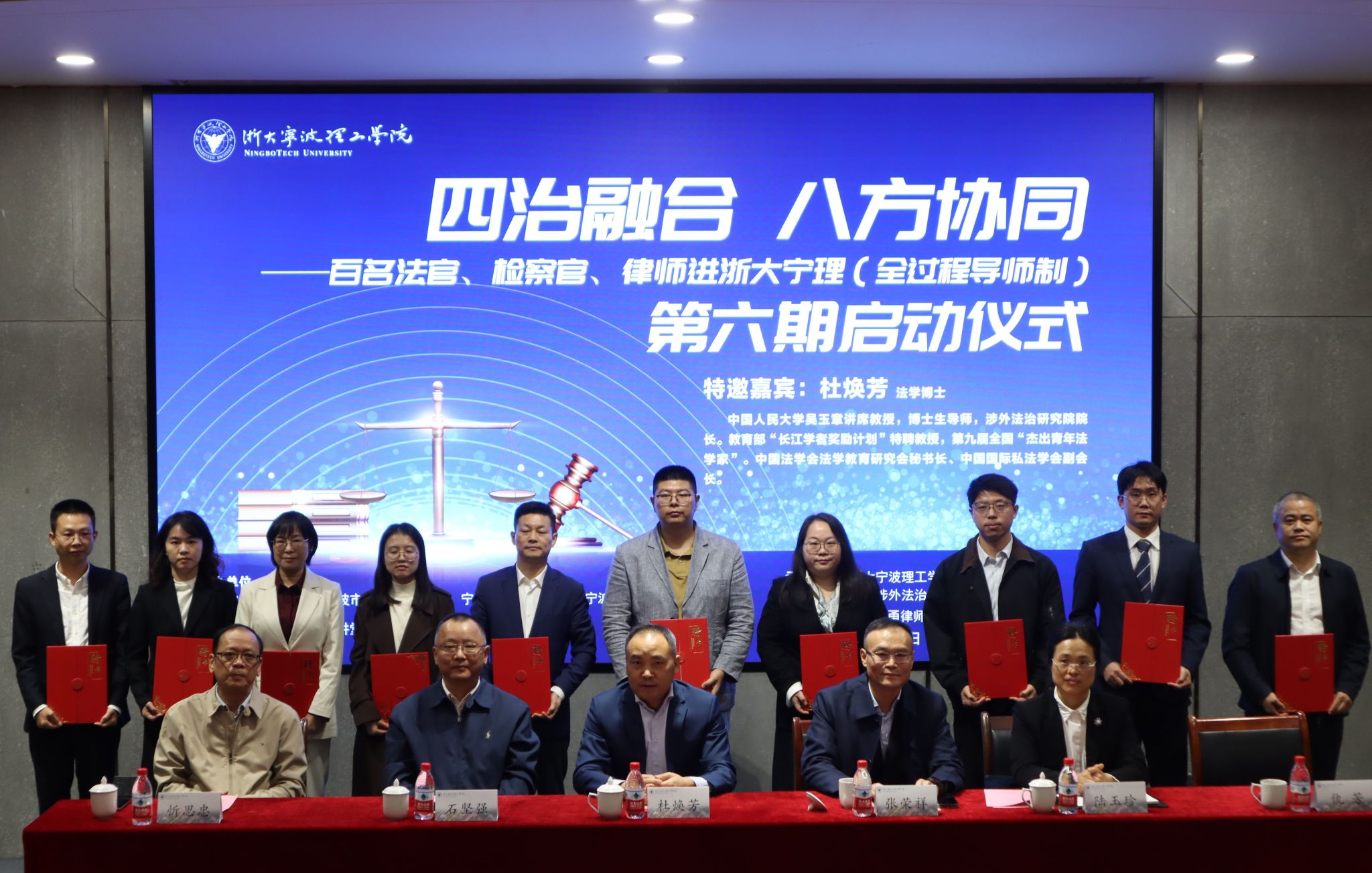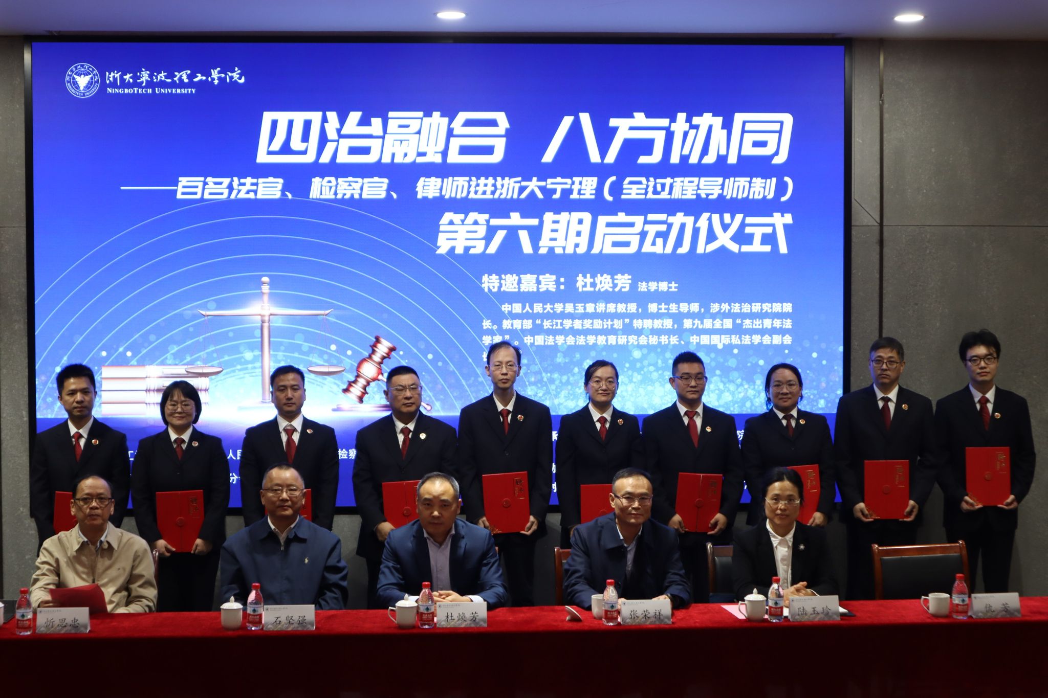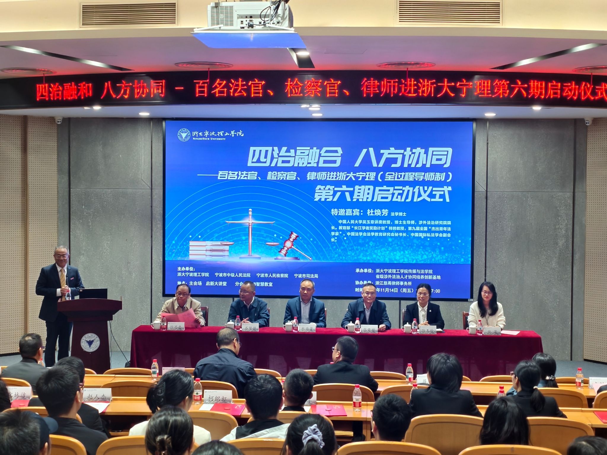 11月14日下午,由我校与宁波市中级人民法院、宁波市人民检察院、宁波市司法局联合举办的“百名法官、检察官、律师进浙大宁理”(全过程导师制)第六期活动启动。此次活动特别邀请到我国著名国际法学者、中国人民大学吴玉章讲席教授,中国人民大学涉外法治研究院院长、教育部“长江学者奖励计划”特聘教授、第九届全国“杰出青年法学家”杜焕芳出席,为法治人才培养注入前沿理论与高端智慧。本期活动还吸引了宁波市中级人民法院,市检察院,市司法局多位负责人和我校师生共同参与,标志着校地共建法治共同体迈入新阶段。