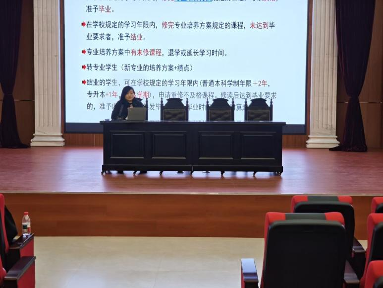 教务办陶艳萍着重进行了毕业指导。她详细介绍了毕业资格审核的各项要求和流程,包括课程学分审核、毕业资格自查、课程重修等环节,指导学生对照专业培养方案核查课程修读情况,特别提醒同学们关注通识选修课学分的修读状况,确保同学们能够顺利完成学业。